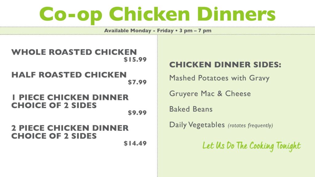 Sioux Falls Food Co+op’s hot bar now serves roasted chicken for dinner. Get a whole or half chicken or one- or two-piece dinners with a choice of two sides. The chicken is available from 3 to 7 p.m. weekdays in the natural foods grocery store at 18th and Minnesota.