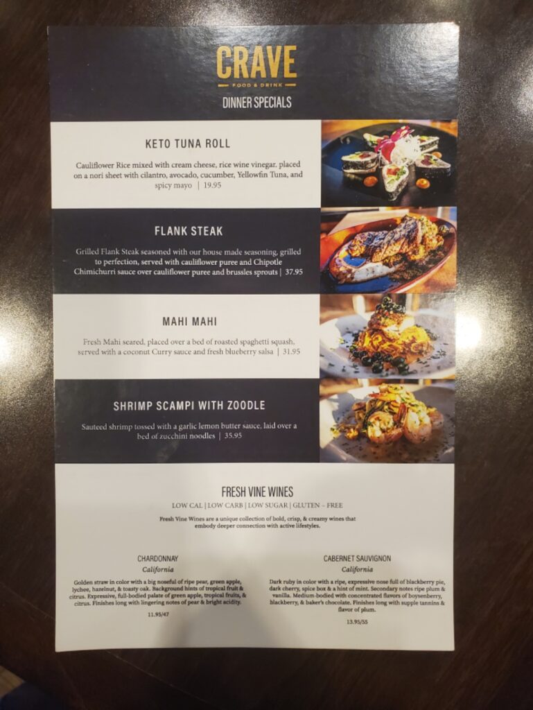 Crave American Kitchen & Sushi Bar has partnered with Minnesota-based Fresh Vine Wine to offer special lunch and dinner wine and food pairings. Lunch and dinner offerings include a keto tuna roll, mahi mahi and shrimp scampi with zucchini noodles. For supper, there’s also a flank steak served with cauliflower puree, Brussels sprouts and chimichurri sauce. The restaurant in the Hilton Garden Inn Downtown carries Fresh Vine Wine’s low-carb, low-calorie and low-sugar Chardonnay and Cabernet Sauvignon, which are made in California. Founders of the company include “Dancing with the Stars” judge Julianne Hough and “Vampire Diaries” actress Nina Dobrev. The special menu choices typically change the second week of the month.