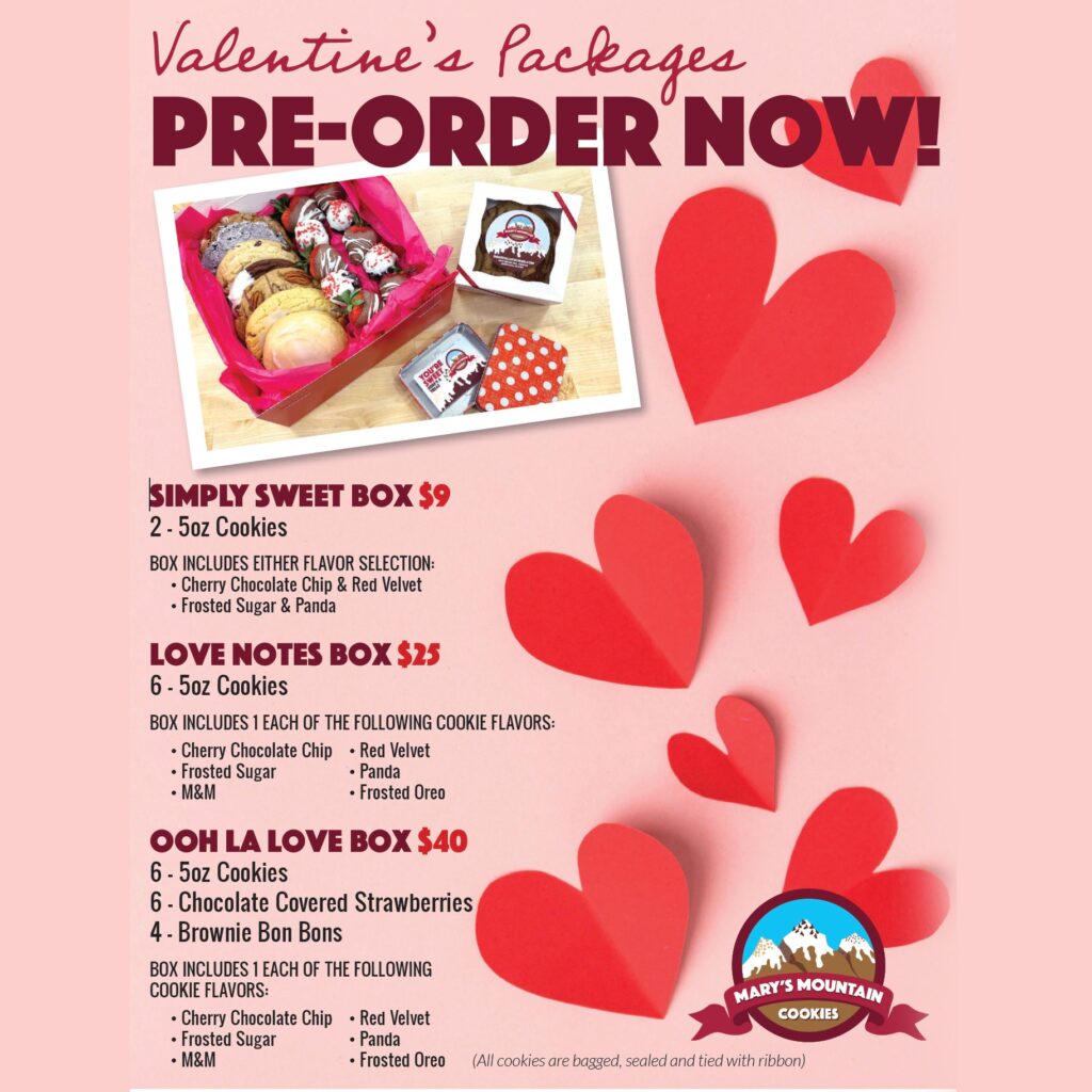 The new Mary’s Mountain Cookies is taking pre-orders for its Valentine’s Day packages. The bakery on North Phillips also just added two of the cookies in the boxes to its seasonal lineup: cherry chocolate chip and red velvet.