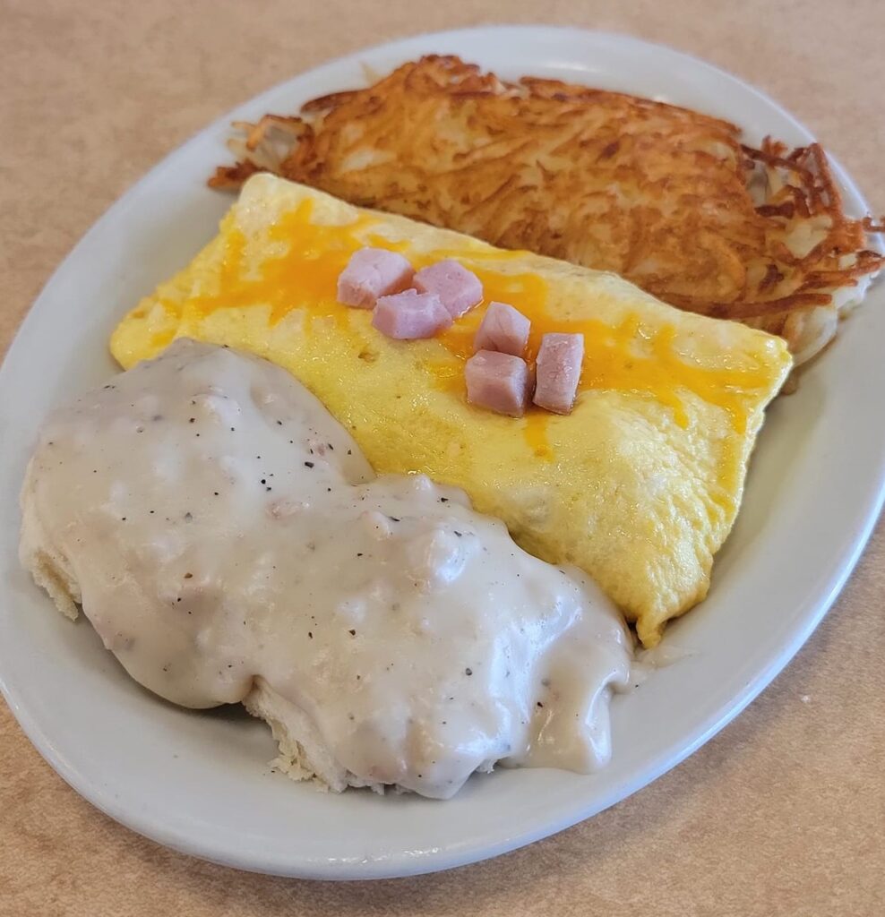 Fans of Mike’s Special, which made frequent appearances as a special at Crack’d Pot, will be happy to know that it is now a permanent fixture on the breakfast menu, which is available all day. It’s a three-egg ham and cheese omelet, a half-order of biscuits and gravy, and hash browns.