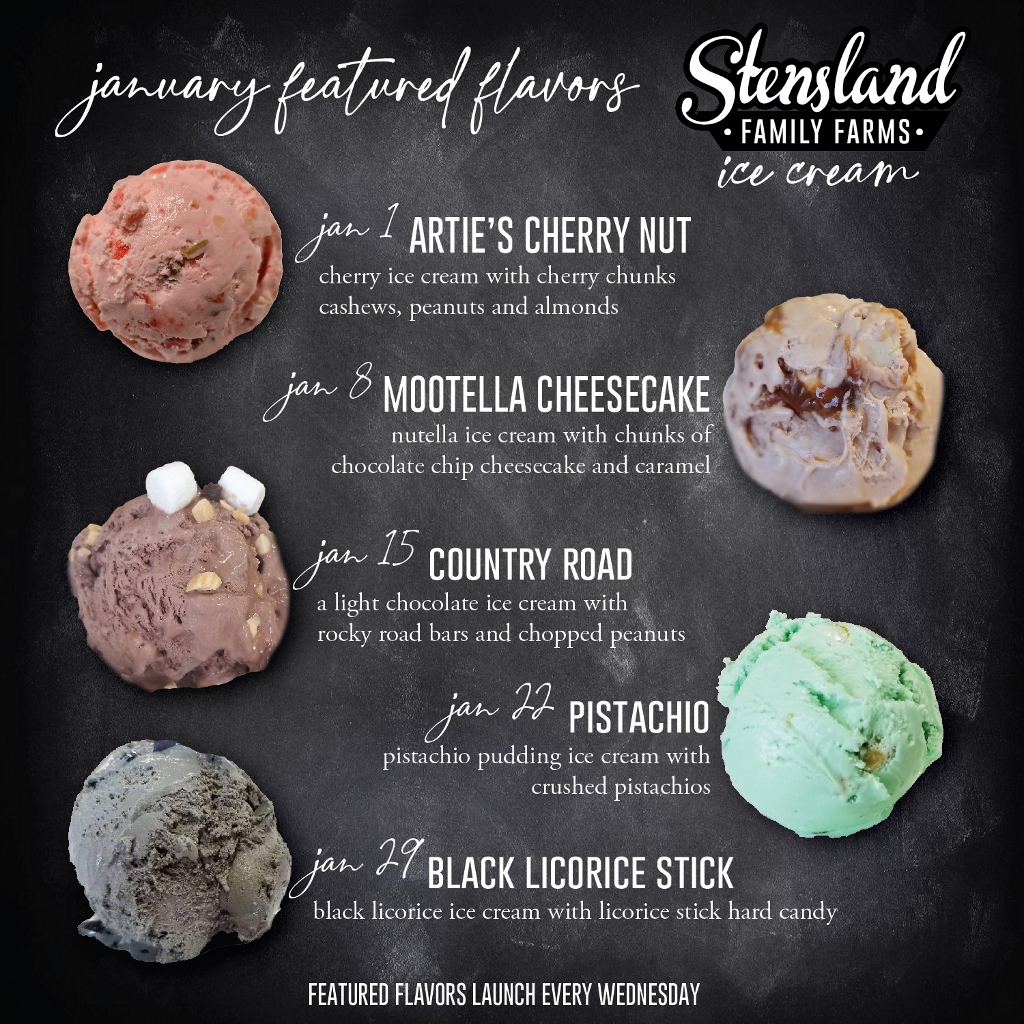 Those who love black licorice ice cream will want to take note of the schedule for January’s weekly flavors at Stensland Family Farms.