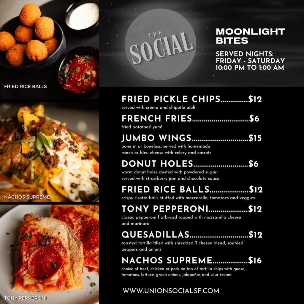 There’s also a Moonlight Bites menu at Union Social from 10 p.m. to 1 a.m. Fridays and Saturdays.