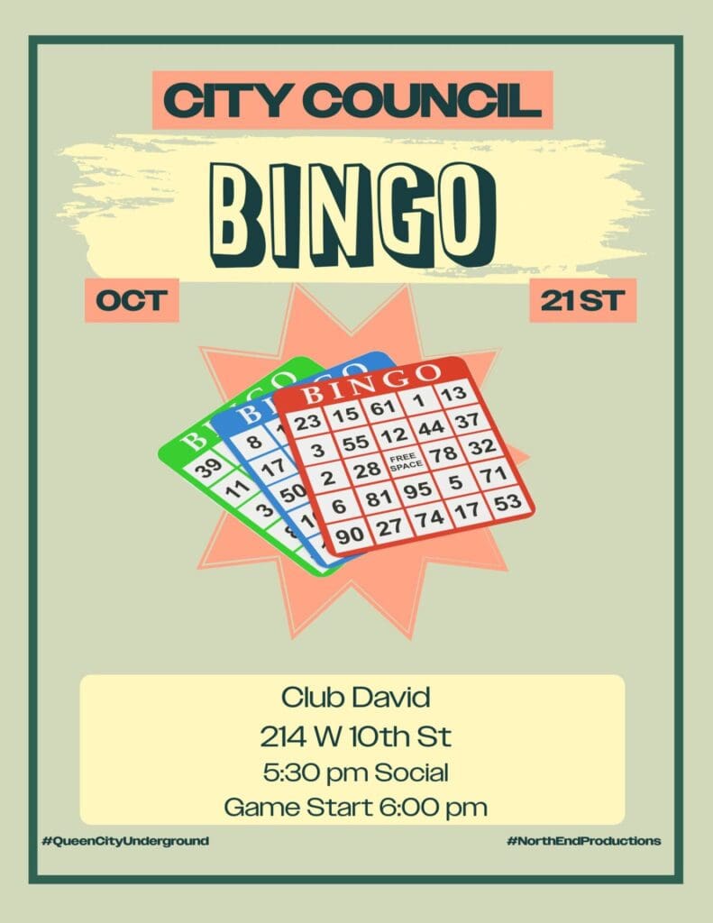 City Council Bingo nights are being hosted by Queen City Underground at Club David. Patrons watch the livestreamed meeting and mark spaces on their bingo cards when certain facts, figures or buzzwords are mentioned. The next round starts at 6 p.m. Tuesday, with social time at 5:30 p.m.