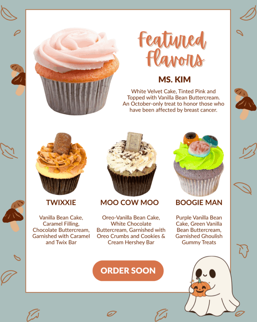 The featured flavors for October at Oh My Cupcakes are the annual appearance of Ms. Kim to honor those affected by breast cancer, Twixxie, Moo Cow Moo and the Halloween-themed Boogie Man.