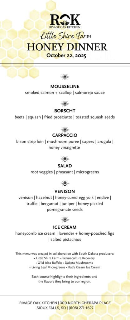 The new Rivage Oak Kitchen is hosting its first dinner event Wednesday, Oct. 22. The six-course Honey Dinner will feature Little Shire Honey as an ingredient in tasting portions of mousseline, borscht, carpaccio, salad, venison and ice cream. Ingredients from several other local producers will be featured. Tickets are $75, and the deadline for reservations is 5 p.m. Sunday.
