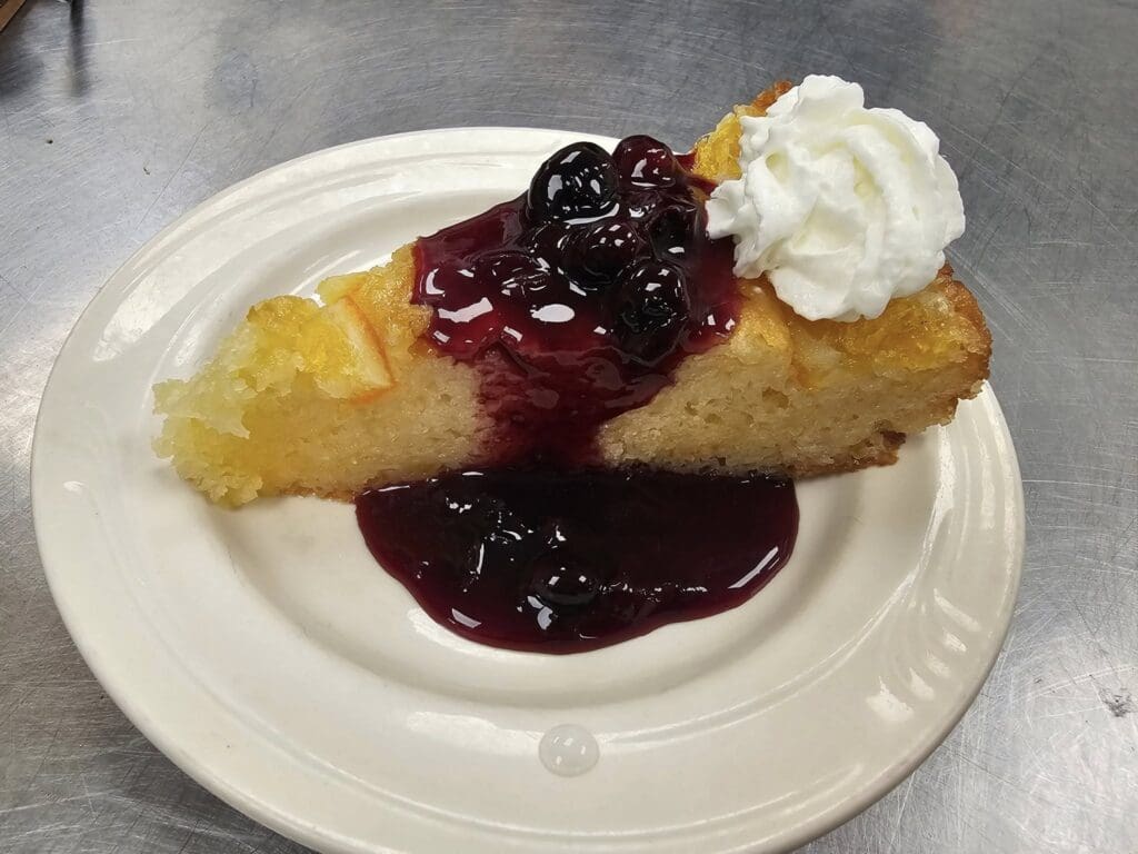 The dessert of the month at Squealer’s Smoke Shack in Tea is orange phyllo cake with blueberry compote.