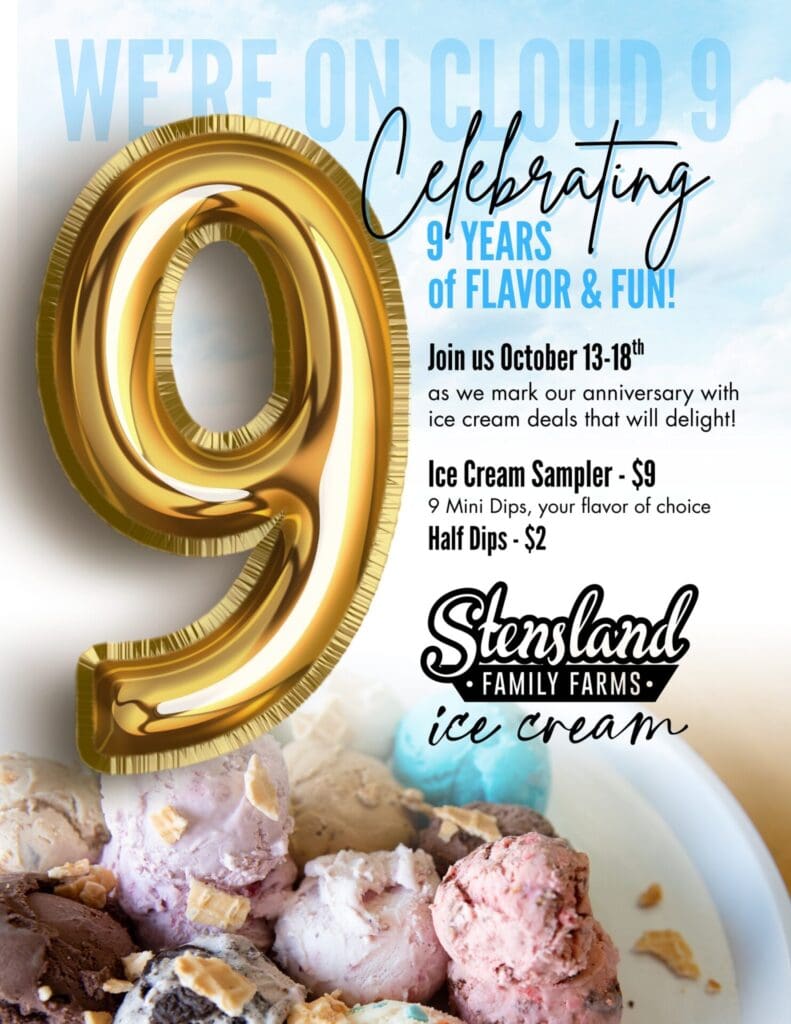 Stensland Family Farms is celebrating its ninth anniversary through Saturday with $2 ice cream dips and $9 sampler bowls. Check out the “end of season concessions blow-out sale” while you’re there for deals on frozen pizzas, breakfast sandwiches, candy and jerky.