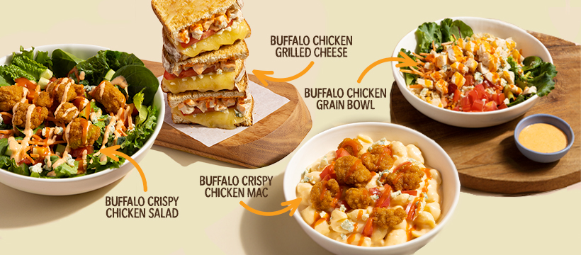 Zoup is serving buffalo chicken in four ways. Try the Buffalo Crispy Chicken Salad, Buffalo Chicken Grain Bowl, Buffalo Crispy Chicken Mac or the Buffalo Chicken Grilled Cheese.