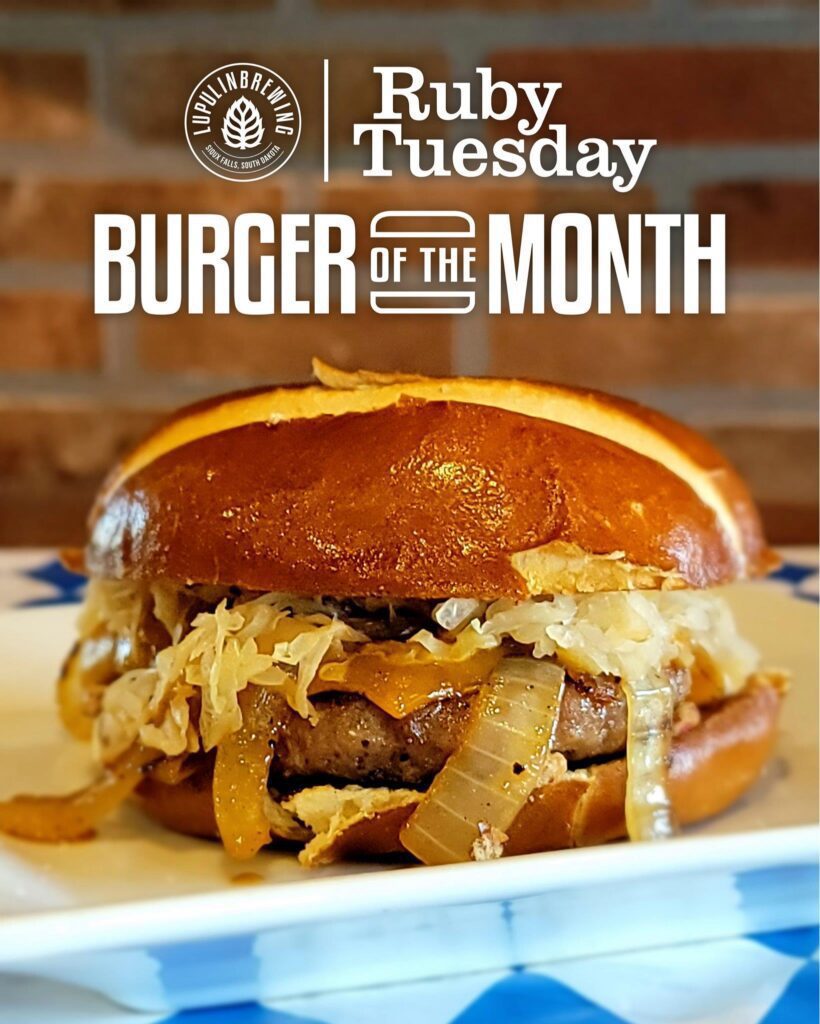 The monthly partnership between Lupulin Brewing Co. and neighboring Ruby Tuesday is celebrating Oktoberfest. The exclusive burger for October is a bratwurst patty topped with cheddar cheese, onions sauteed in Oktoberfest beer, sauerkraut and spicy mustard on a pretzel bun. It comes with a side of fries or tots.