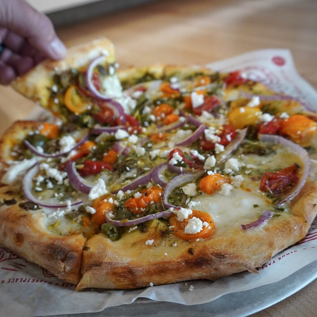 The featured pizza of the month at Look’s Marketplace is The Pesto Pie. The hand-tossed crust is topped with almond pesto, Greek olive, red onion, feta, fresh mozzarella, lemon and cherry tomatoes.