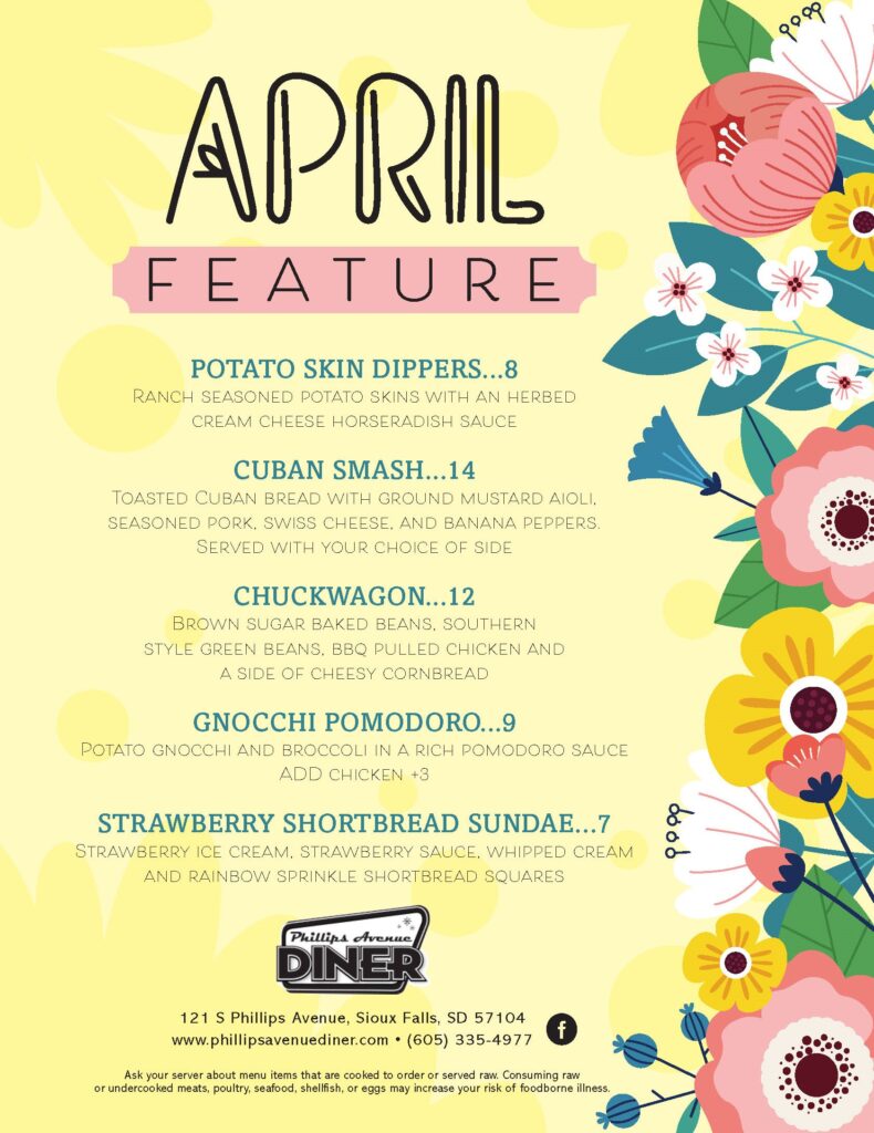 The featured menu for April at the Phillips Avenue Diner features potato skin dippers, the Cuban Smash sandwich, gnocchi pomodoro and the Chuckwagon, which combines brown sugar baked beans and Southern-style green beans with pulled barbecue chicken and is served with a side of cheesy cornbread. The dessert special is a strawberry shortbread sundae.