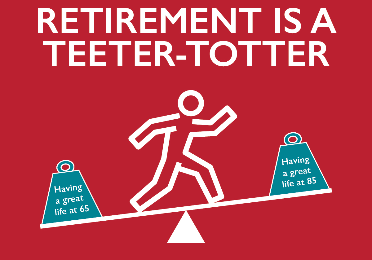 Retirement is like a teeter-totter – on one end is wanting to have a great life today, on the other end is wanting to have a great life when you’re 85 and in the middle is you trying to balance both ends. Because retirement is a long journey – and a front-loaded one, at that – people often deny themselves early on.