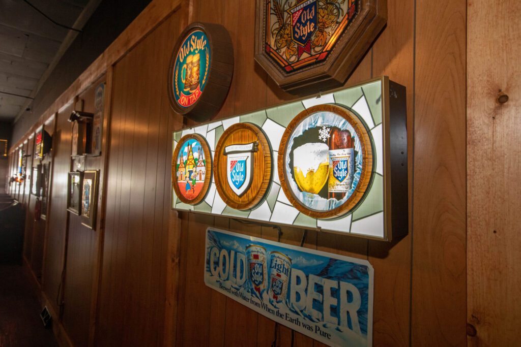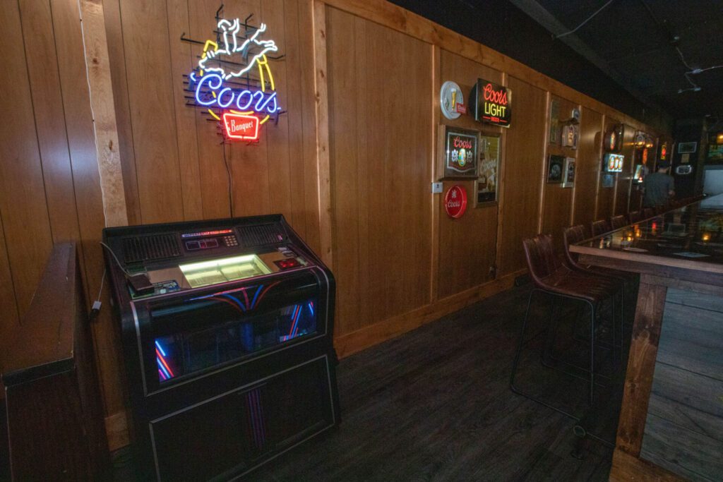 One wall is covered in wood paneling. There are beer signs, mounted deer heads, vinyl barstools, a row of old beer cans and a jukebox.