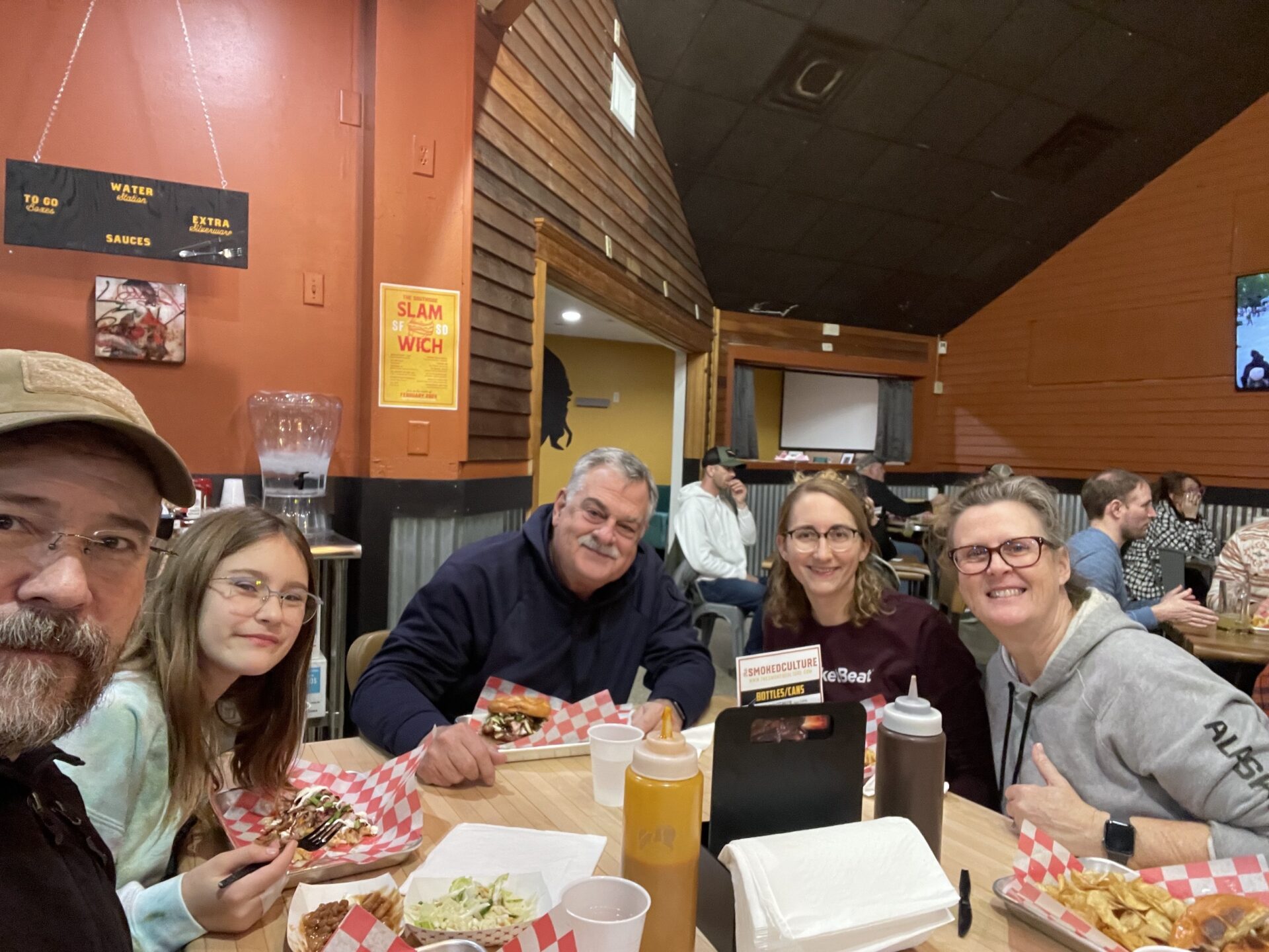 Don and Linda Miller, center and right, enjoy dinner with co-worker Rebecca McKeever and family.