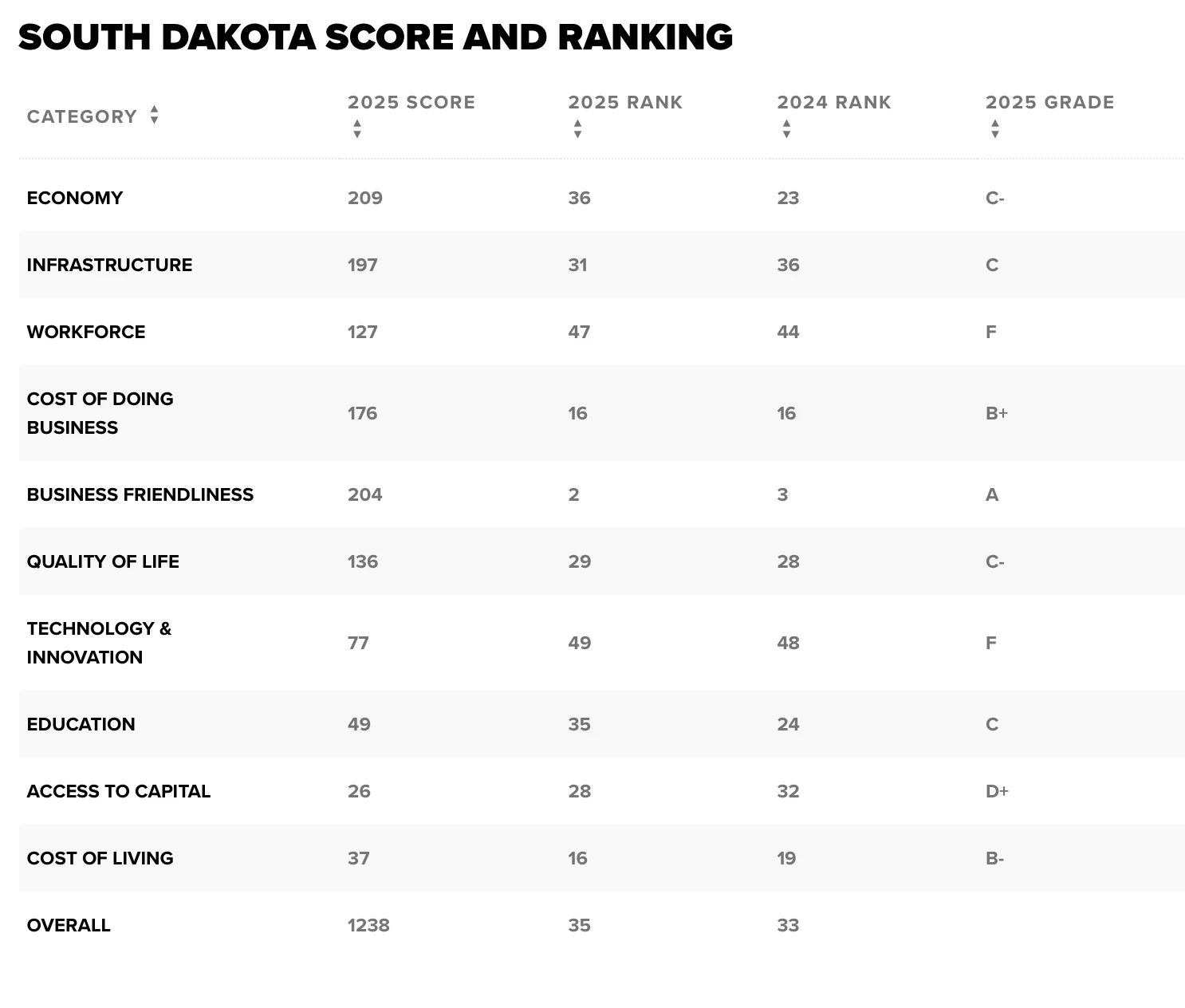 South Dakota ranked second best for business friendliness, behind North Dakota. The state ranked second to last in technology and innovation.