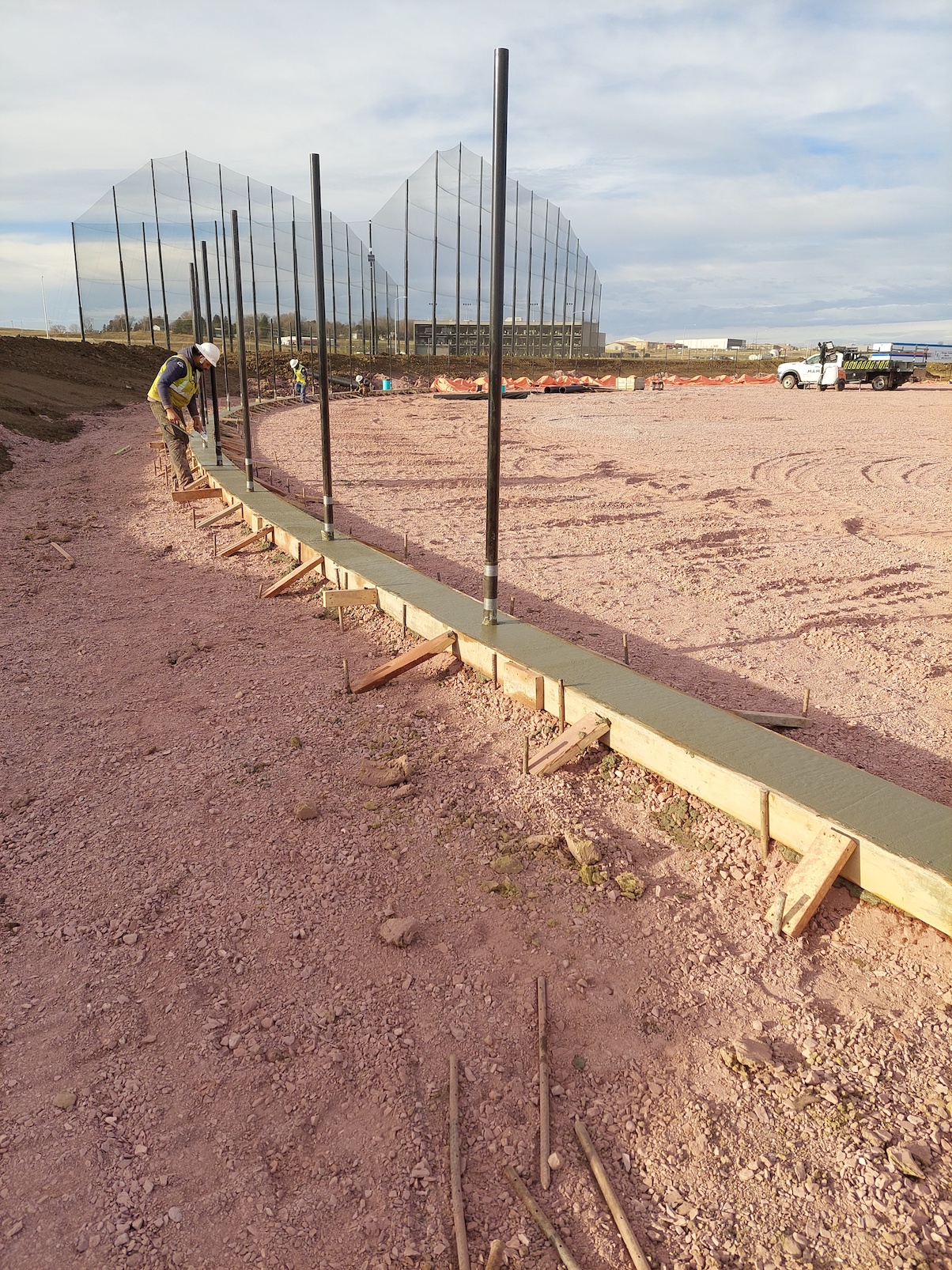 Concrete is being used throughout the project as stem walls to hold in aggregate, for backstops around walls where the grandstand goes, in sidewalks, parking lots, curb and gutter, and the mounds on the fields.