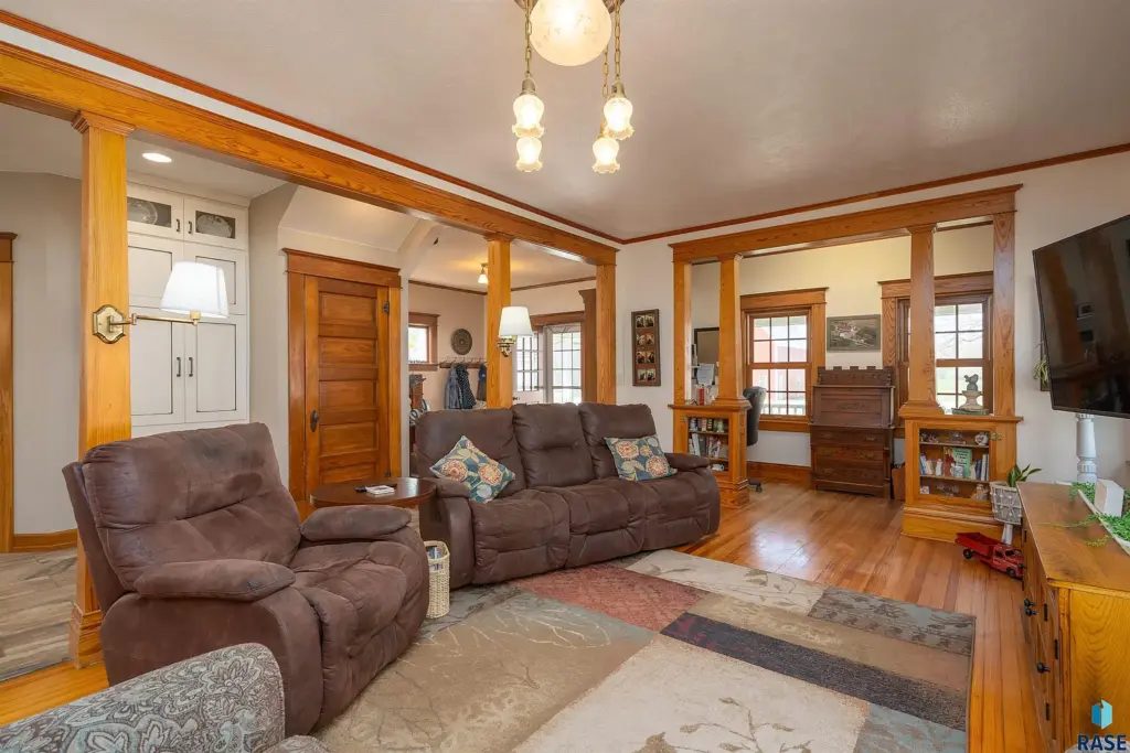 Classic detailed columns and impeccable woodwork give a striking look to the large formal living room.