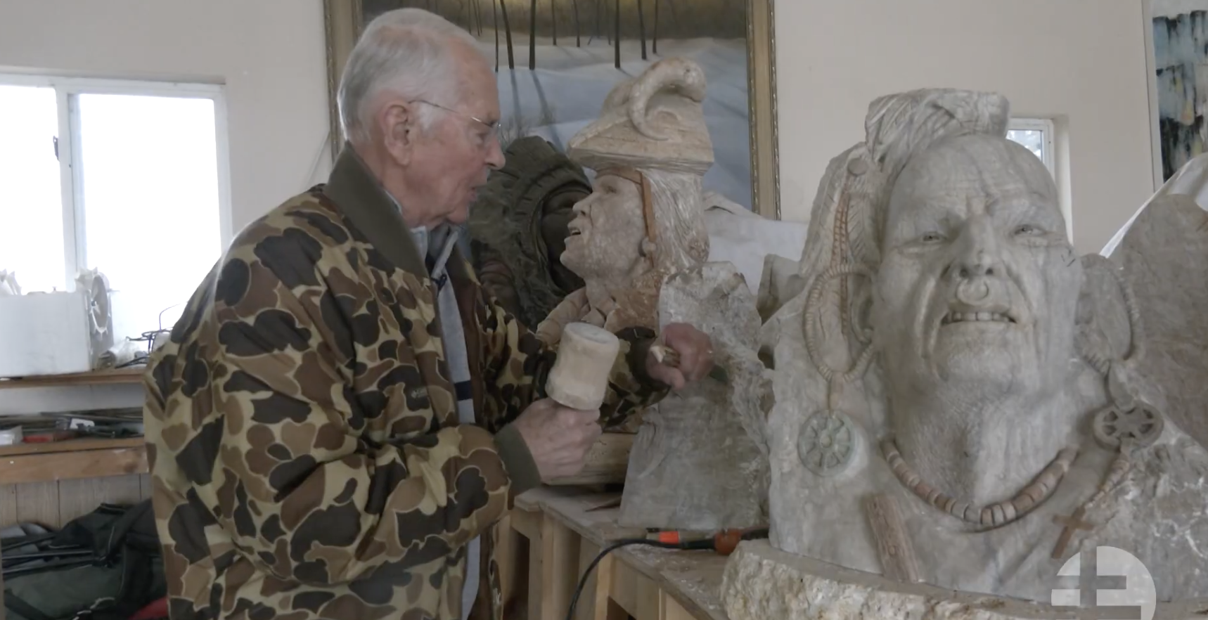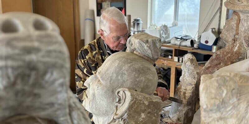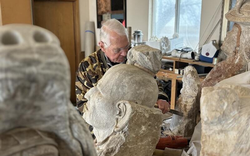 Today, Roger is creating sculptures again by tapping away at them with his handheld tools. His goal is to be back using machines for his sculptures by this summer.