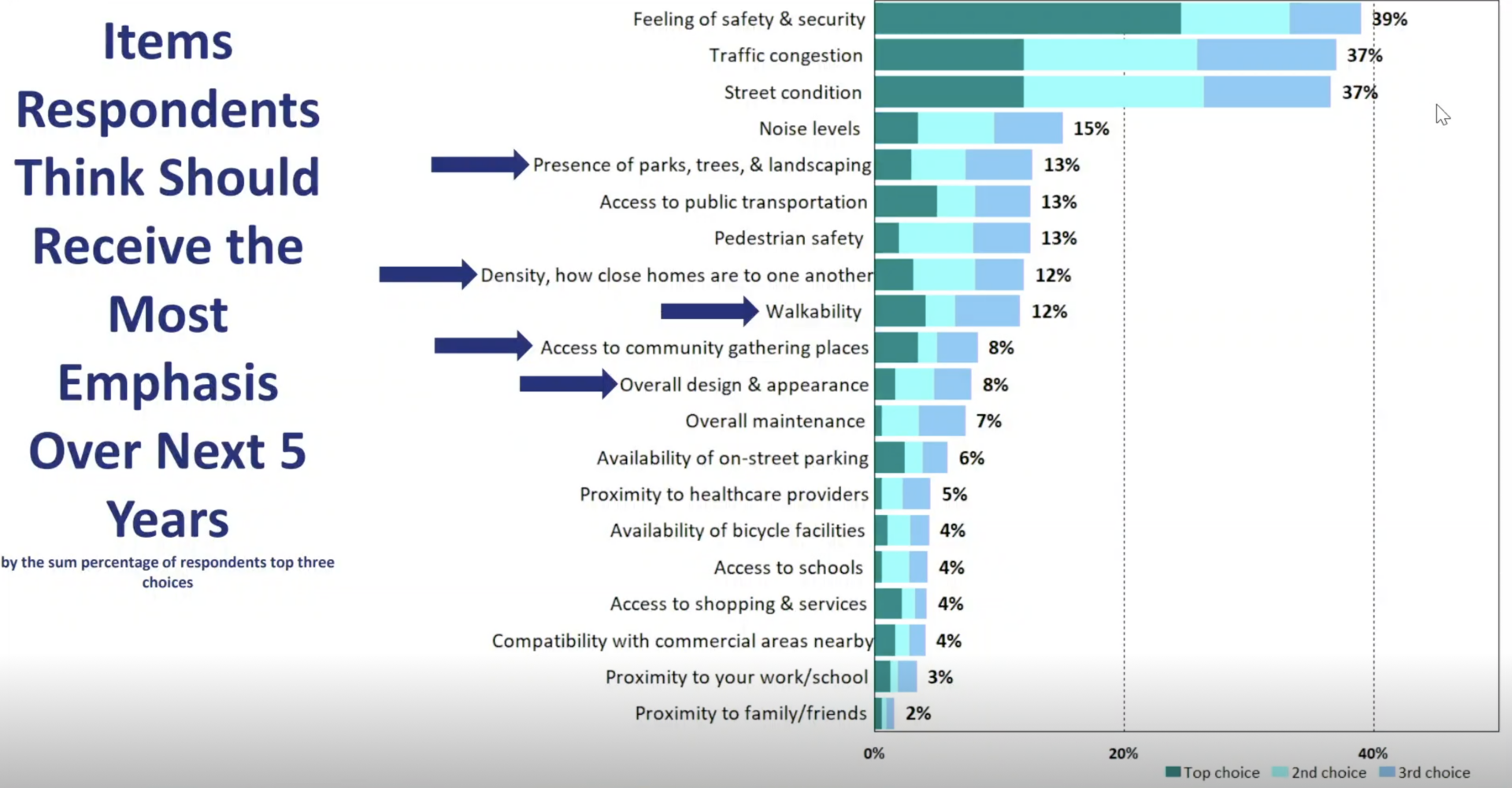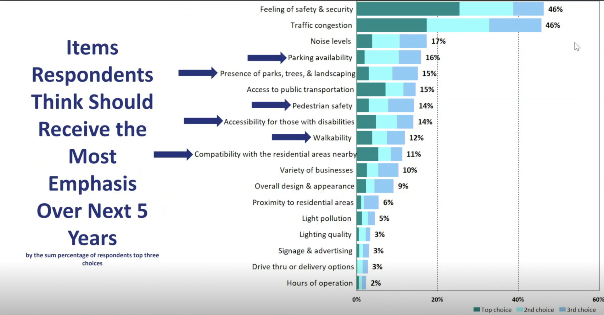 Looking at what items should receive priority in commercial development, residents emphasized feeling safe, traffic congestion and noise.
