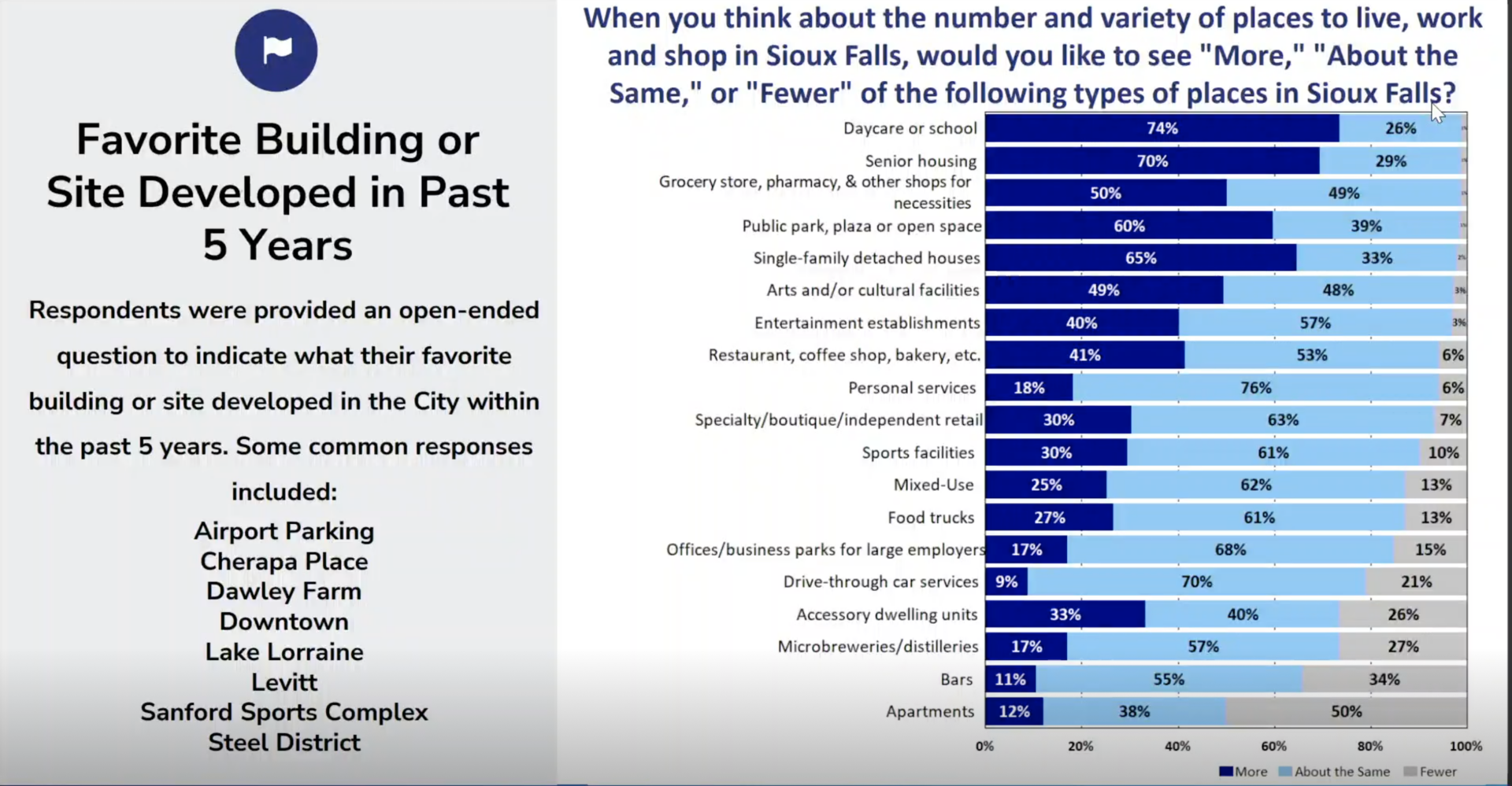 From a business standpoint, residents said they’d like to see more day cares or schools, senior housing and grocery stores and other necessities shops and cited developments both downtown and in newer areas of the city as their favorite development in the past five years.