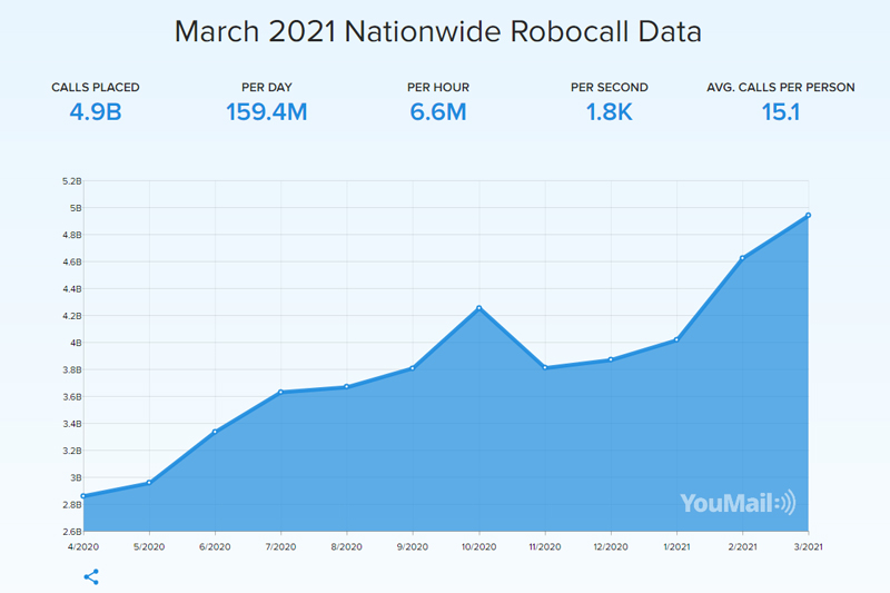 If you’ve simply stopped answering unfamiliar calls, you’re not alone. Robocalls hit phones in the U.S. at a rate of 1,800 calls per second in March. That’s an average of 159.4 million robocalls every day, according to YouMail’s robocall index.