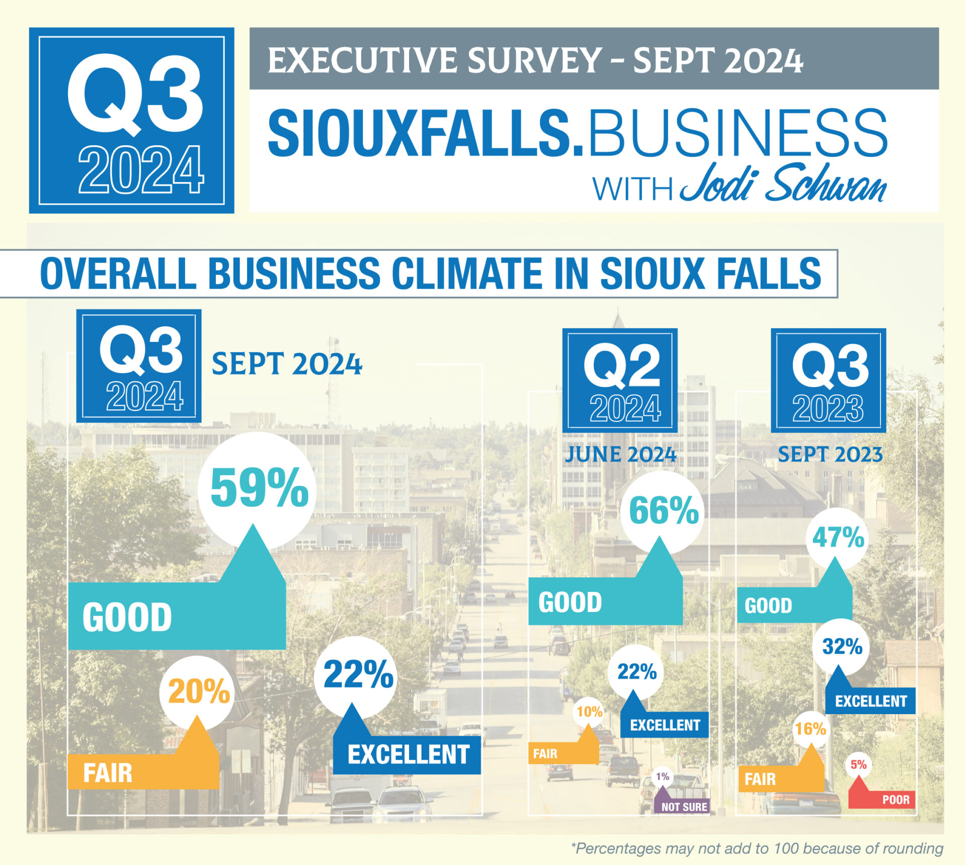 Perceptions of the Sioux Falls business climate, though, have softened in the past three months. Eighty-one percent considered it good or excellent, down from 88 percent three months ago and up slightly from 79 percent a year ago.