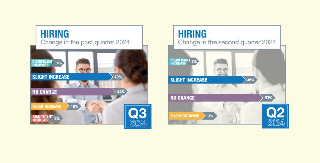 Hiring is holding its own with a slight uptick from three months ago. Forty-four percent of CEOs reported at least some increase in hiring, compared with 38 percent at the end of the second quarter. Twelve percent reported a decrease, also up from 9 percent three month ago.