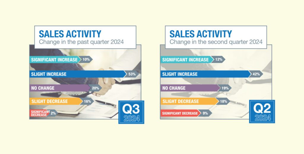 Sales activity is up slightly with 63 percent reporting at least a slight increase, compared with 54 percent three months ago.