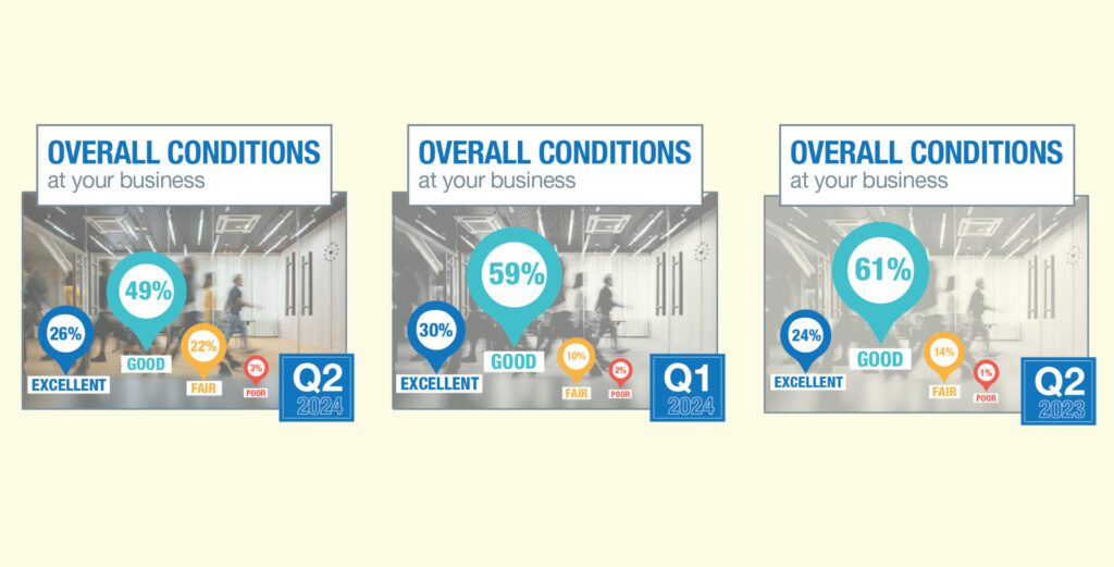 Seventy-five percent said overall conditions at their business were good or excellent, down from 89 percent three months ago and 85 percent a year ago.