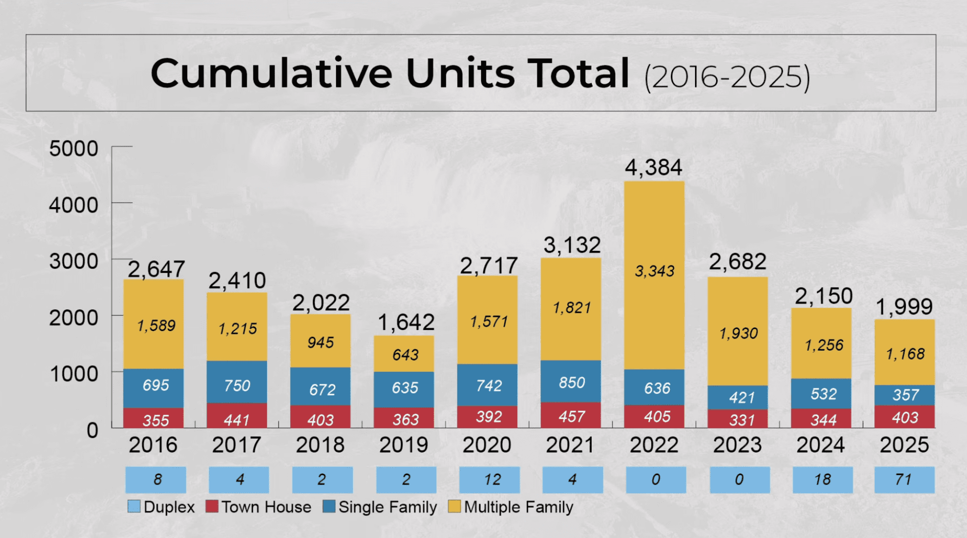 Sioux Falls added nearly 2,000 living units in 2025, slightly behind 2,150 in 2024 and 2,682 in 2023.