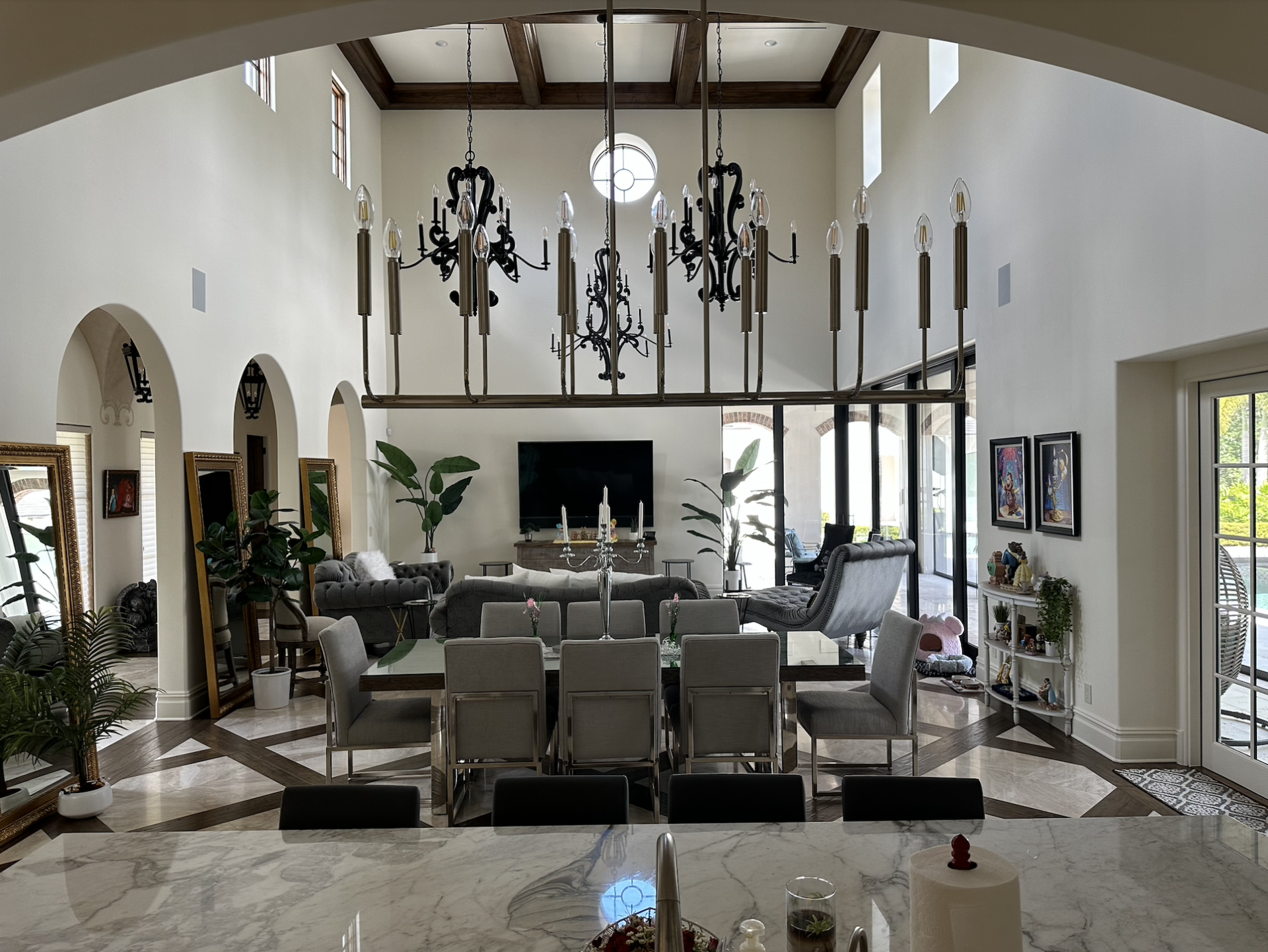 The Beauty & the Beast-themed French chateau-inspired home in the master-planned community of Golden Oak includes a statue of Lumière by the expansive outdoor pool, a rose-adorned stained glass window and a library themed to fit the Disney classic.