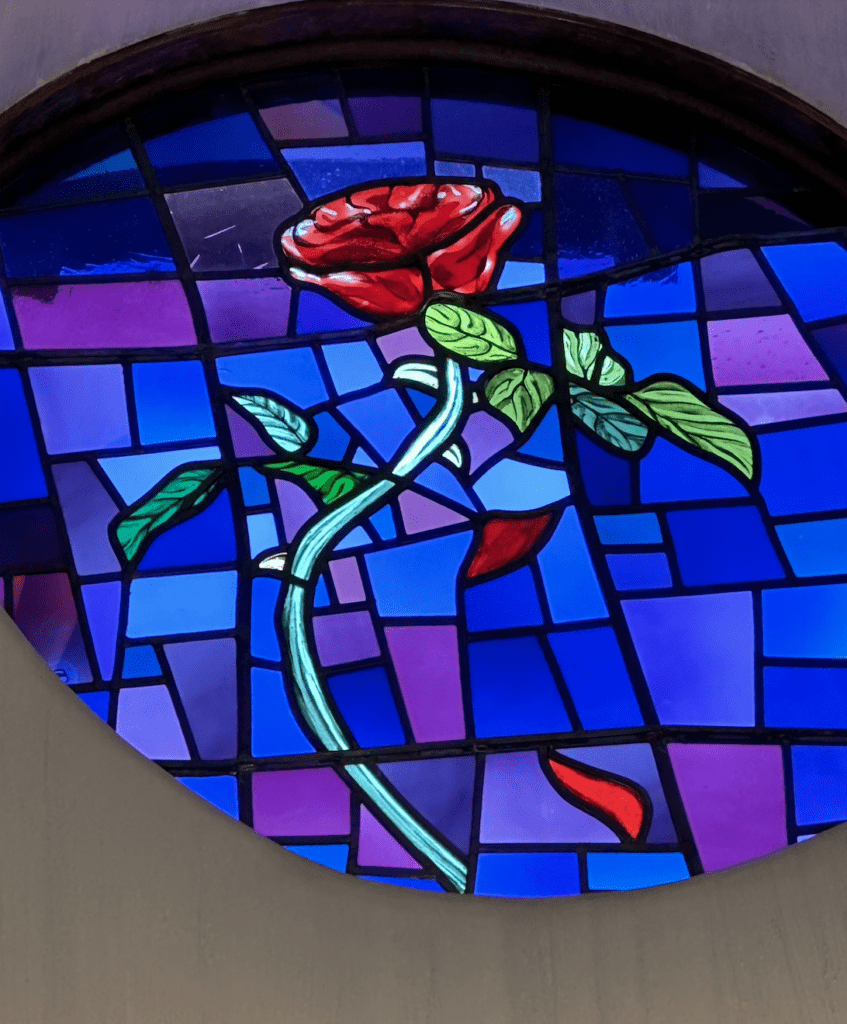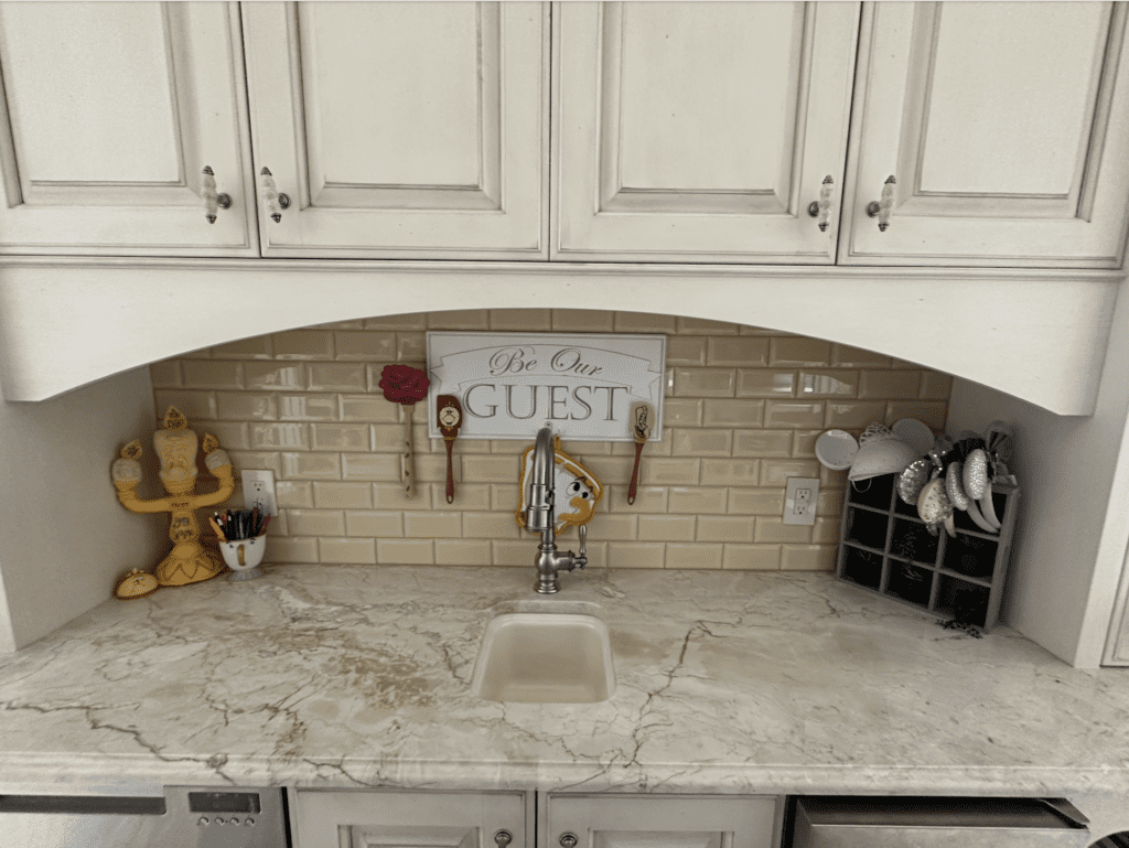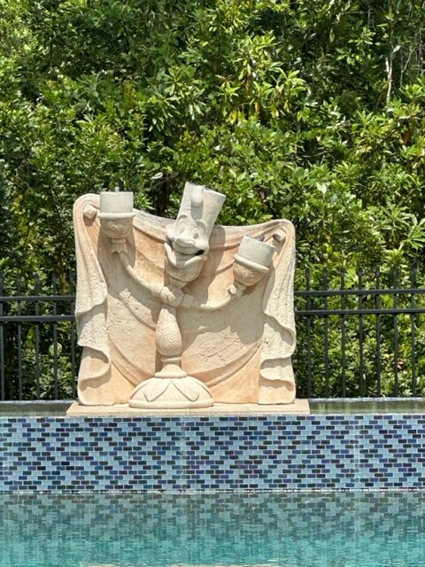 The Lumière statue stayed, though — it has gas flames and sits at the edge of the pool — “and the flooring is just like the flooring in the original animated movie. It’s the same style and theme,” Tupy said.