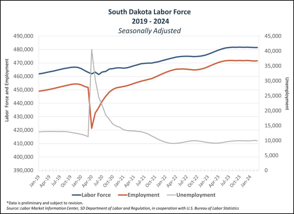In March, South Dakota’s labor force remained unchanged at 481,500. A year ago, it was 478,500.