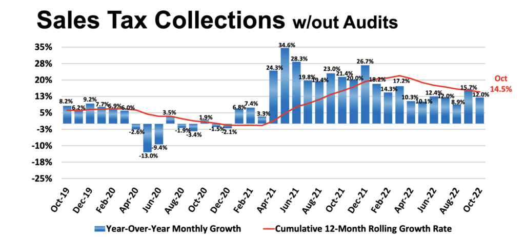 Sales tax revenue received in October, which generally represents actual sales in September, is up more than 12 percent compared with a year ago. The 12-month rolling average is 14.5 percent.