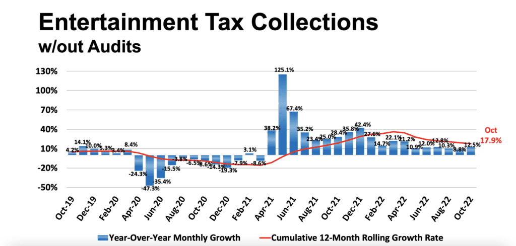 The city’s entertainment tax came in at a 12.5 percent increase in October.