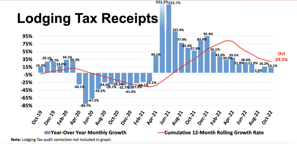 The lodging tax is “coming in very strong, up 14 percent over where they were last year,” Pritchett said. “It’s a very strong figure when you see we’re getting back to a more normalized routine” with better occupancy and hotel revenue.