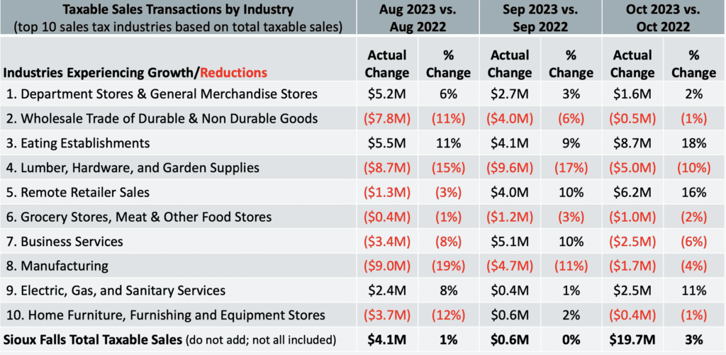 Downward trends in lumber, hardware and garden supplies as well as softness in home furniture continued. Eating establishments saw a spike in October, while grocery sales were down slightly. The business sector, including manufacturing, wholesale and business services, continues to lag behind last year.