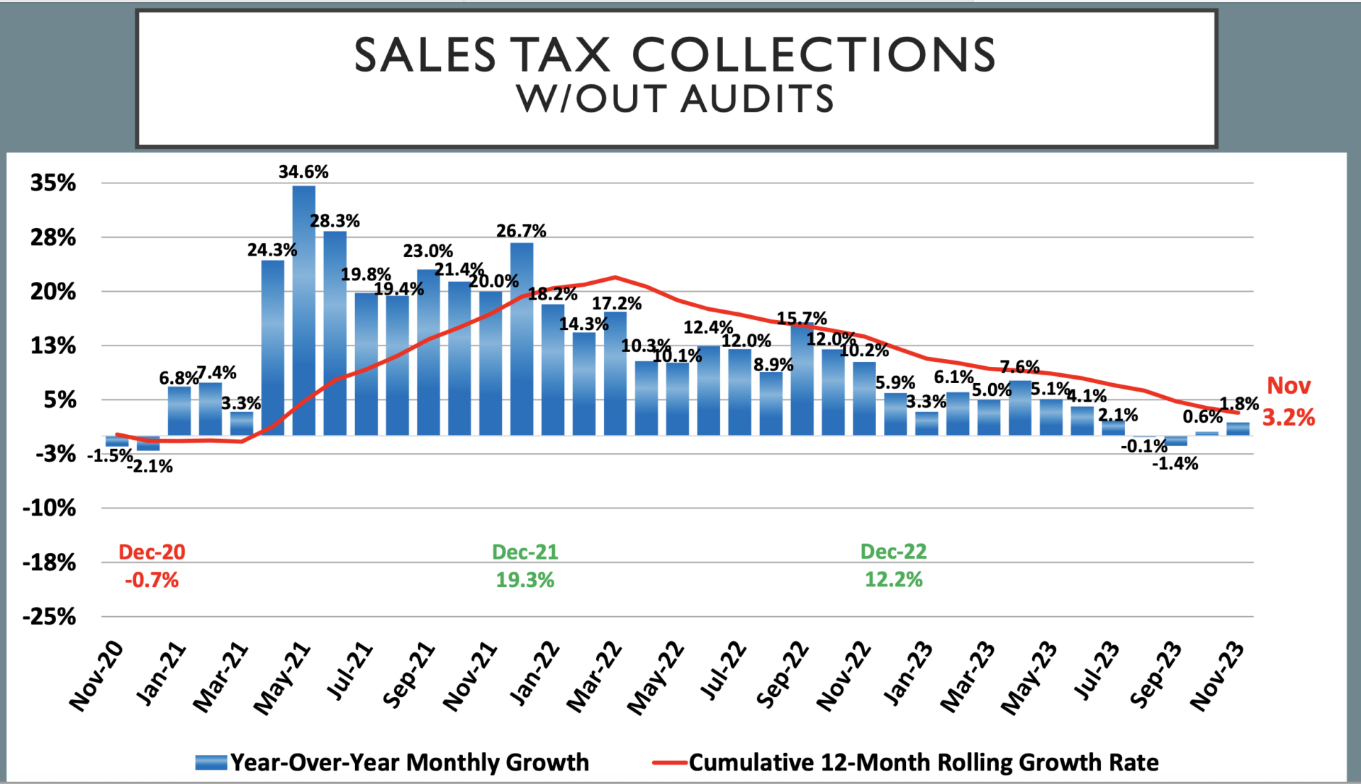 Sales tax in November, which largely represents sales from October, grew 1.8 percent, which is “still below what you would consider inflation at this point, so we’re still not positively seeing any growth number there,” he said.
