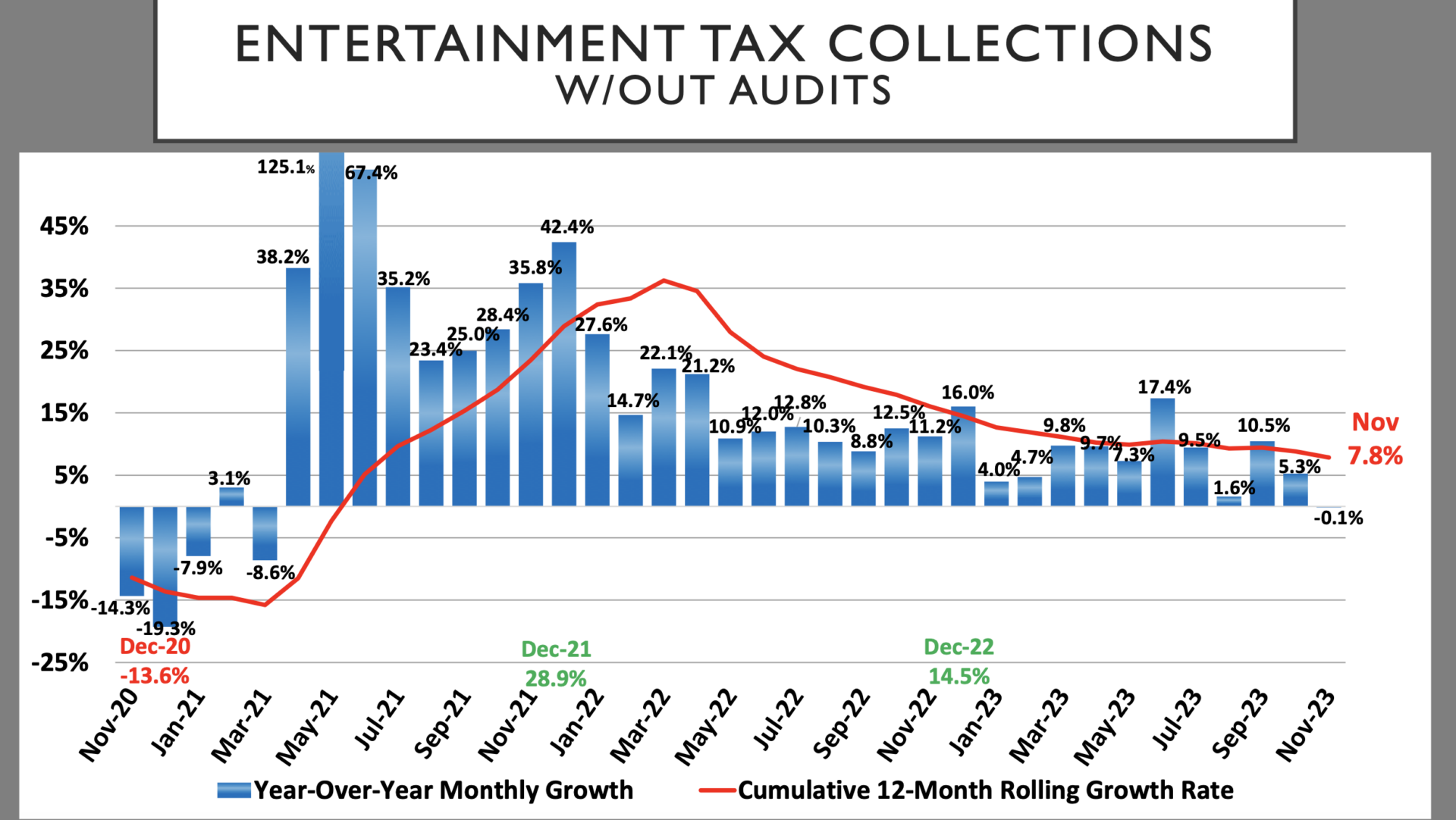 The 12-month rolling average for the entertainment tax is up 7.8 percent.