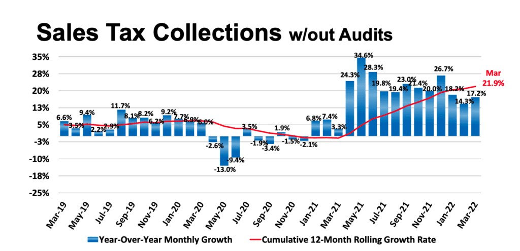 For March’s report, which reflects sales in February, sales tax revenue increased 17.2 percent. For the past 12 months, growth has averaged 21.9 percent.