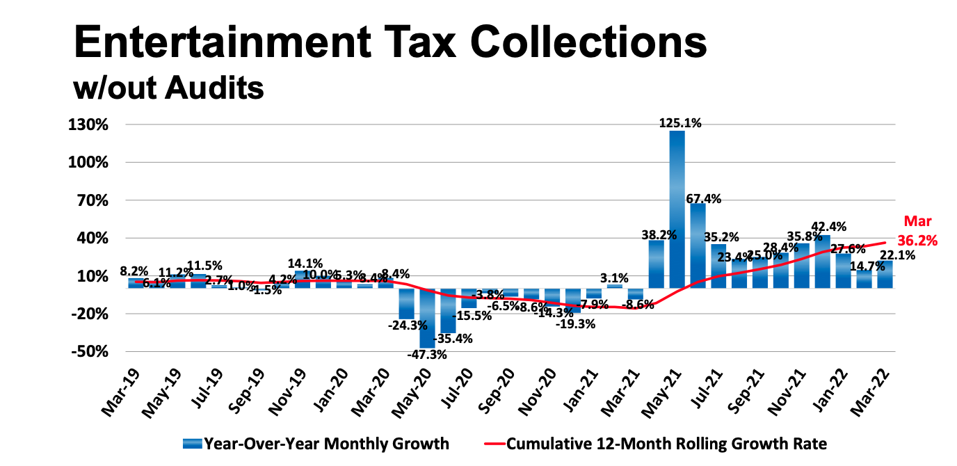 The city’s entertainment tax, which reflects money spent in bars, restaurants and hospitality, was up 22.1 percent in March and is up 36.2 percent for the past 12 months.