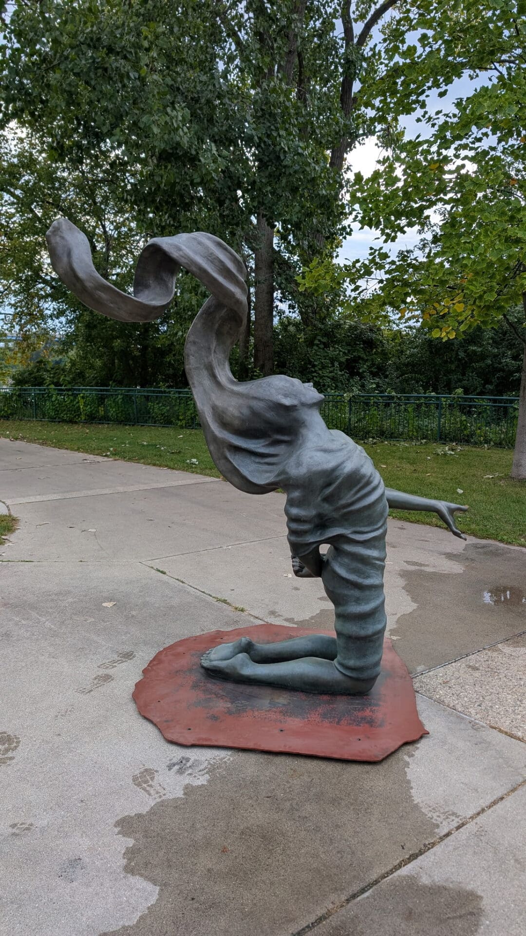 The sculpture Persist presents a kneeling figure enveloped in flowing cloth. The sculptural “folds both conceal and reveal, offering a visual metaphor for how we carry our pasts while gradually releasing them,” according to a statement from Stalheim.