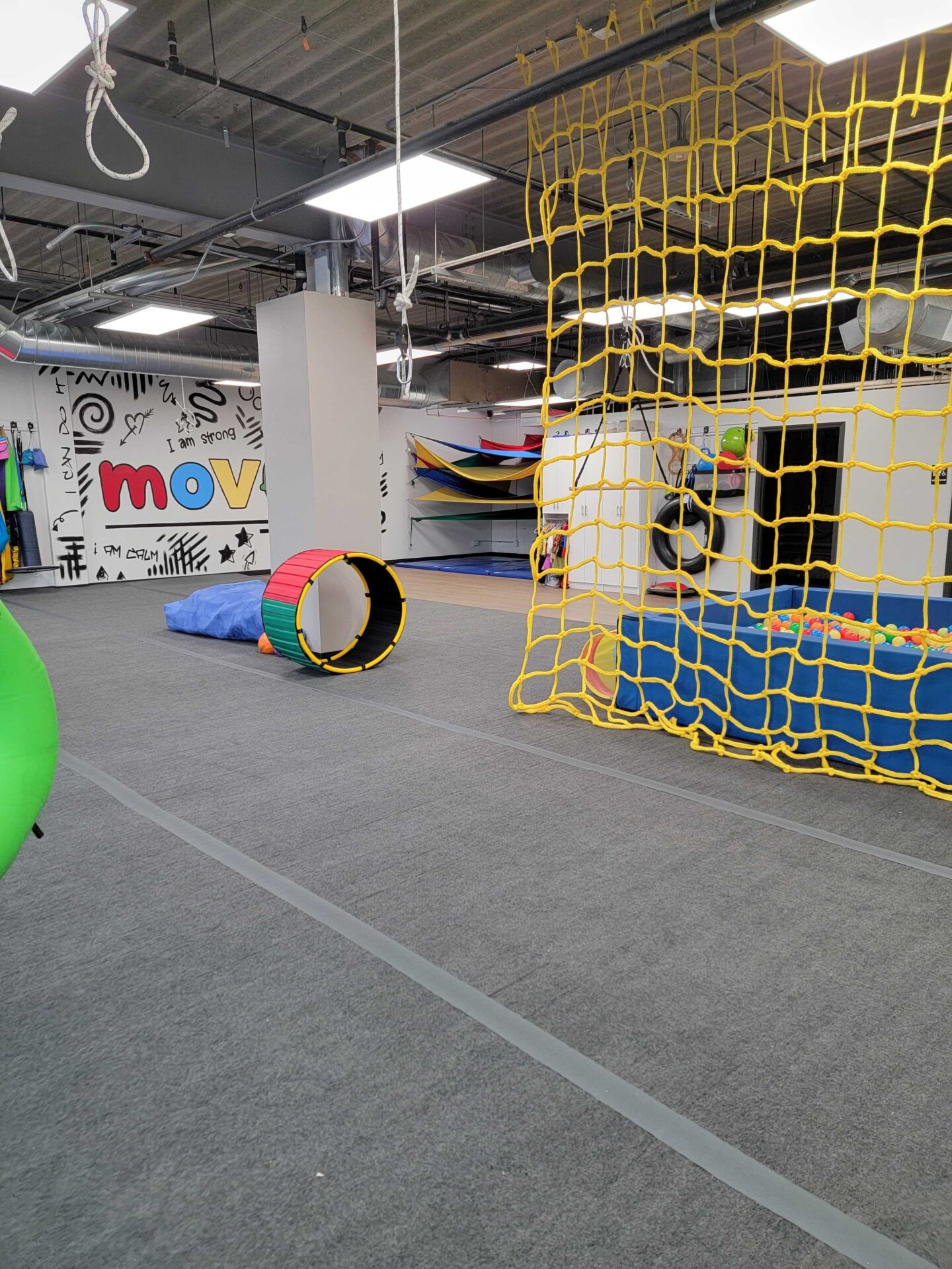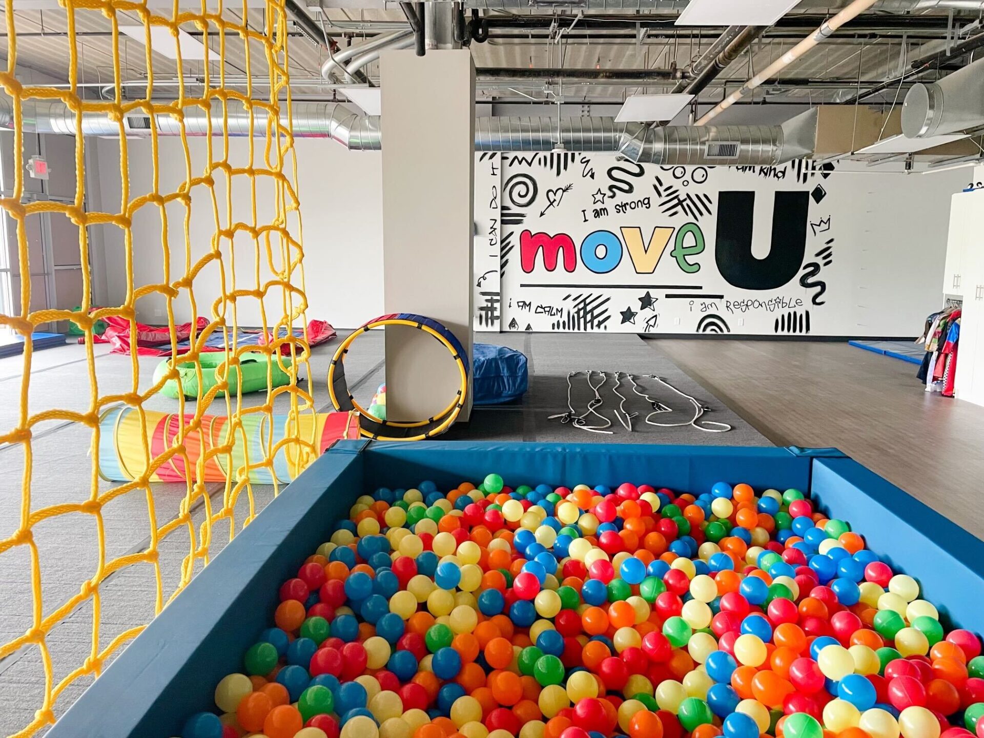 Move U started last year inside All American Gymnastics and recently moved to 5020 S. Tennis Lane in the basement of the former Alpha Graphics building. The 3,200-square-foot space includes gymnastics-style flooring, 12 ceiling hooks for swings that support sensory integration and other play-based activities such as a cargo net, ball pit and trampoline.