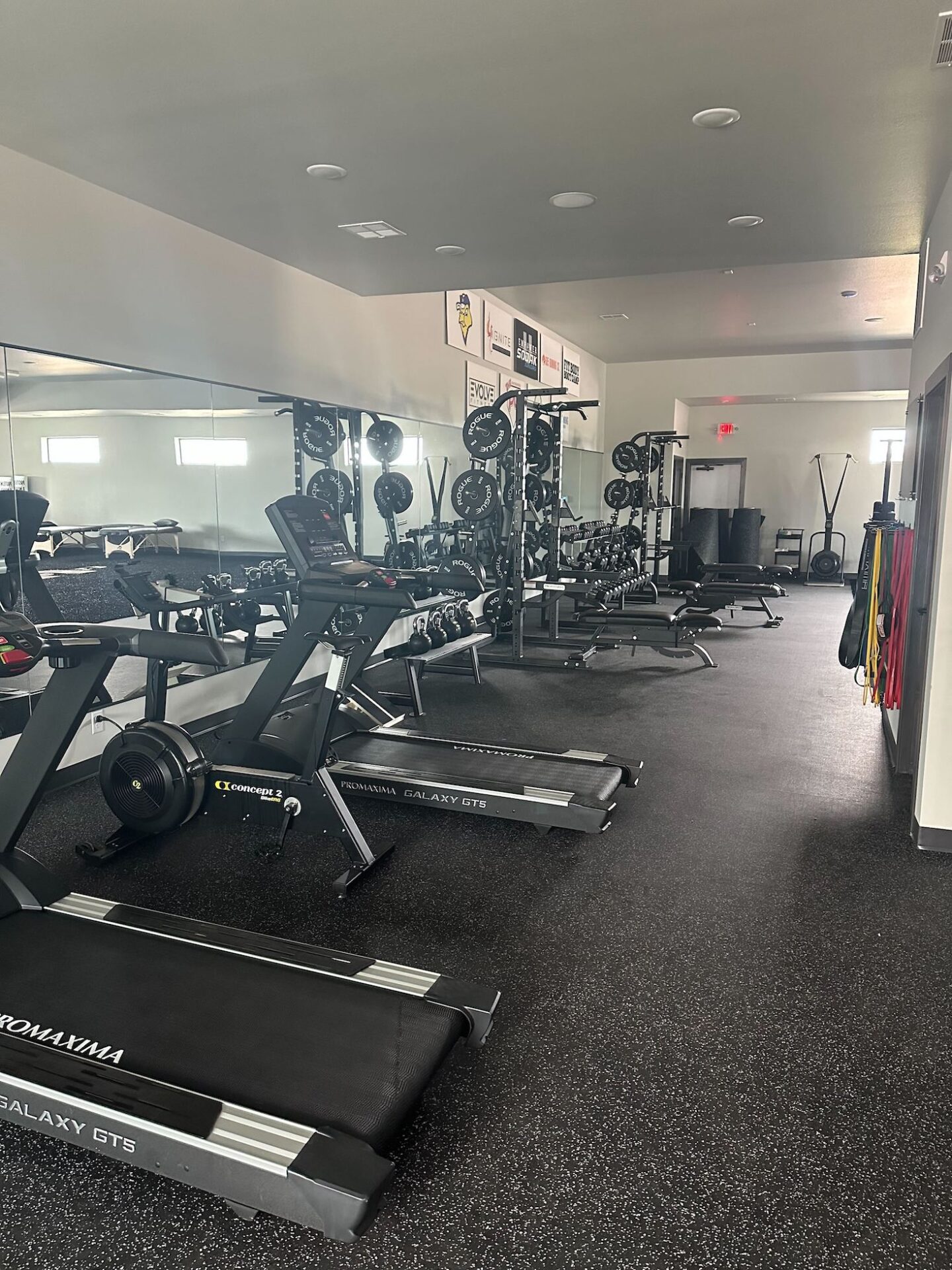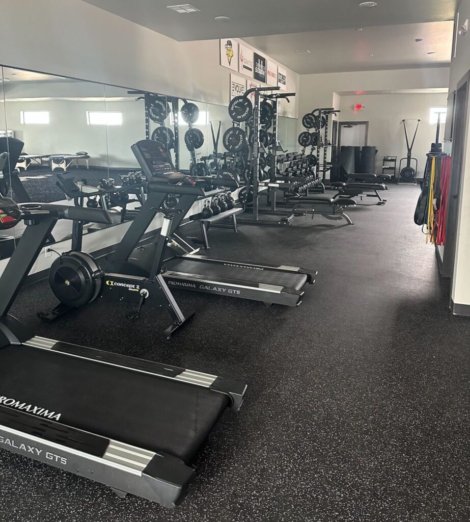The facility includes squat racks, a rower, a skier, bikes, treadmills and free weights, as well as a conference room, community workspace and five treatment rooms.