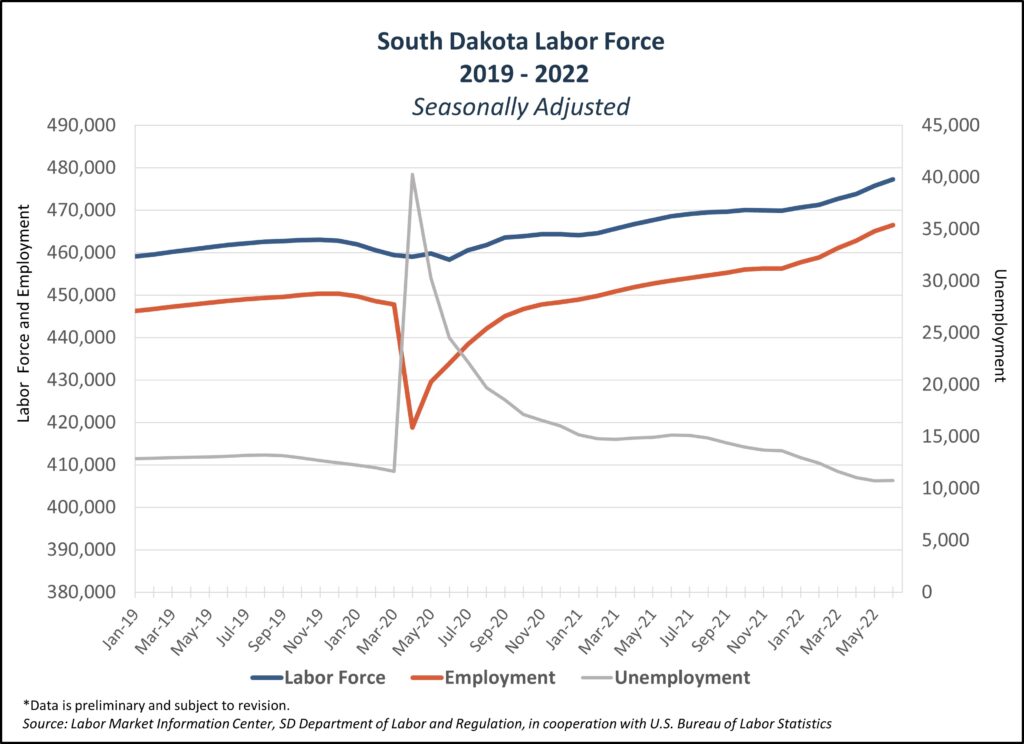 The total labor force, those who are employed and unemployed, was 166,199, up from 163,003 in May, according to statistics from the South Dakota Department of Labor & Regulation.