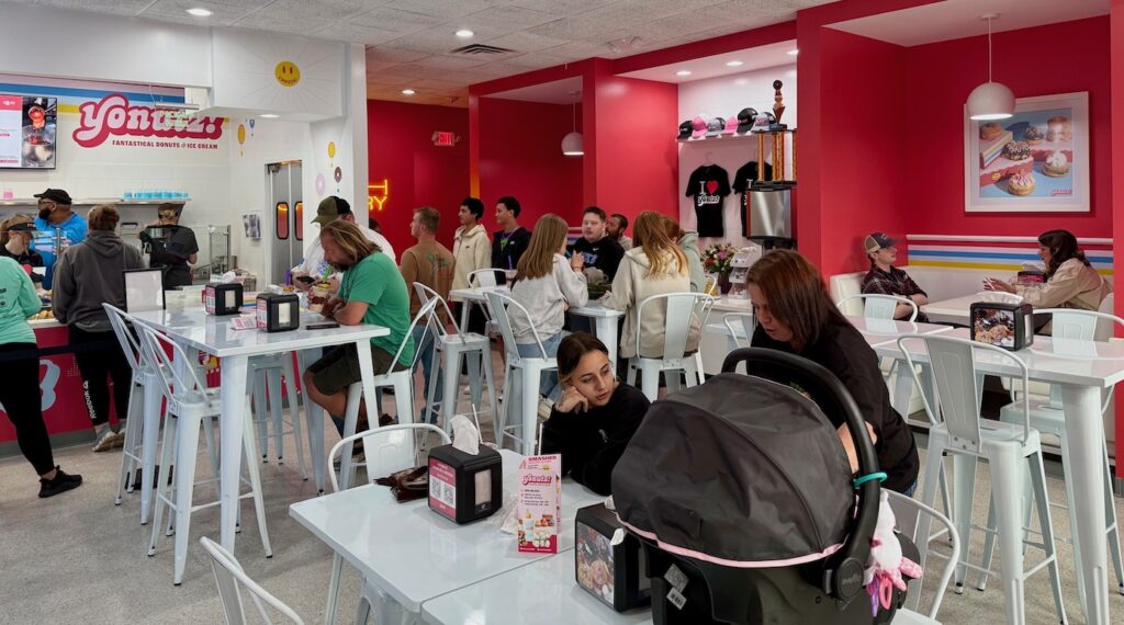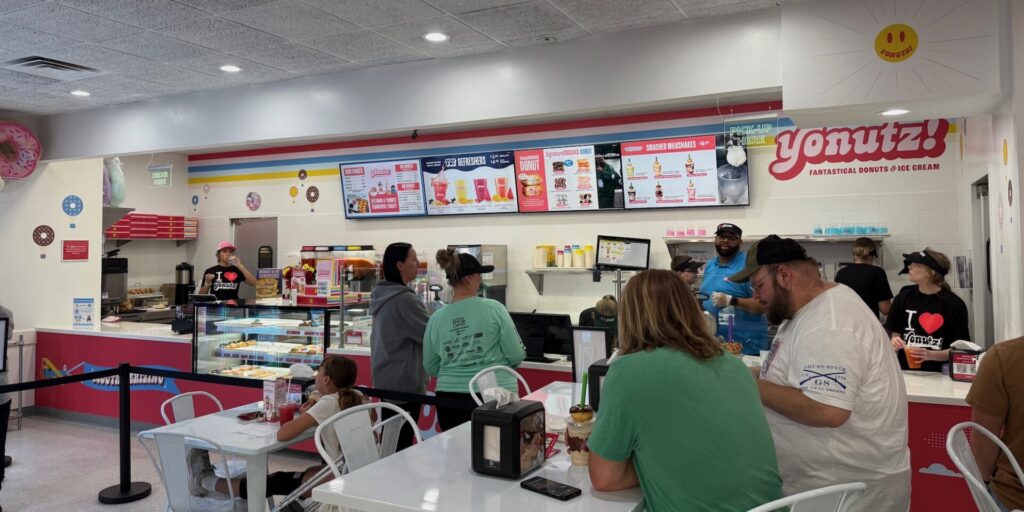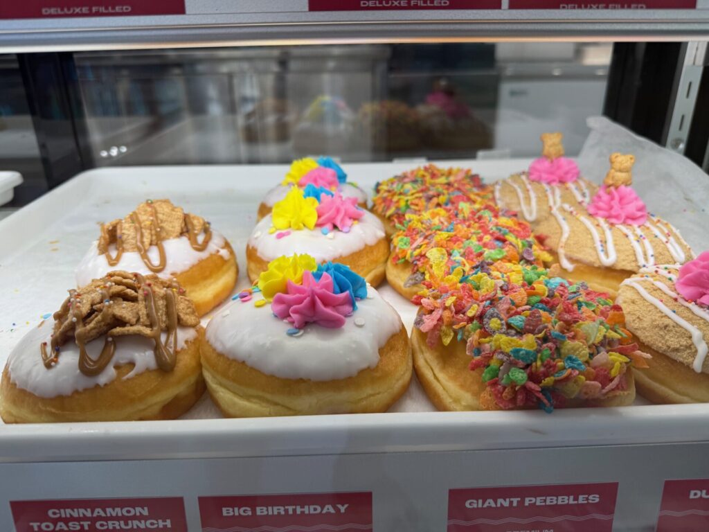Yonutz specializes in smashed doughnuts, combining hot-pressed doughnuts and ice cream together for a dozen combinations such as Birthday Cake, which combines birthday cake ice cream, vanilla drizzle, confetti sprinkles and Little Debbie birthday cake. The Pebble Rebel is strawberry ice cream topped with vanilla drizzle, Trix, Fruity Pebbles and Cap’n Crunch.