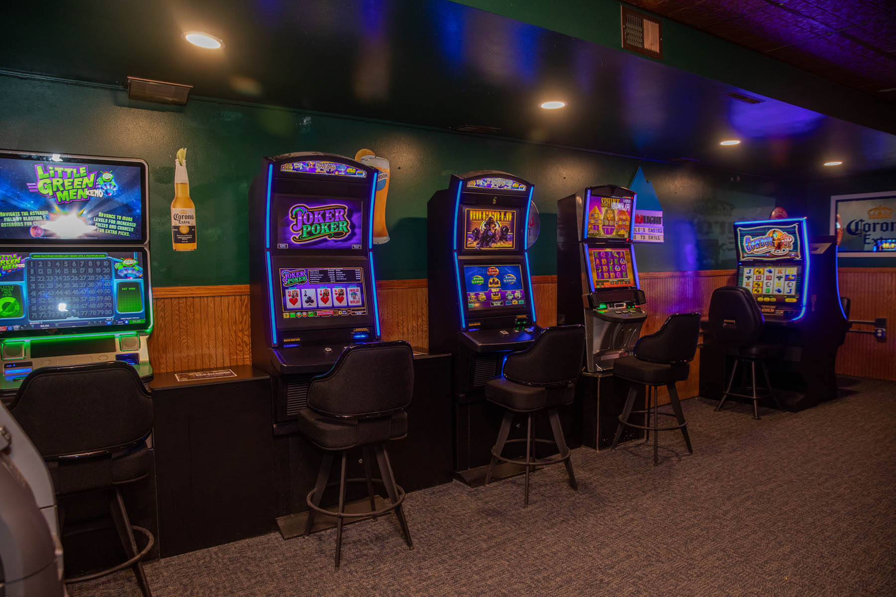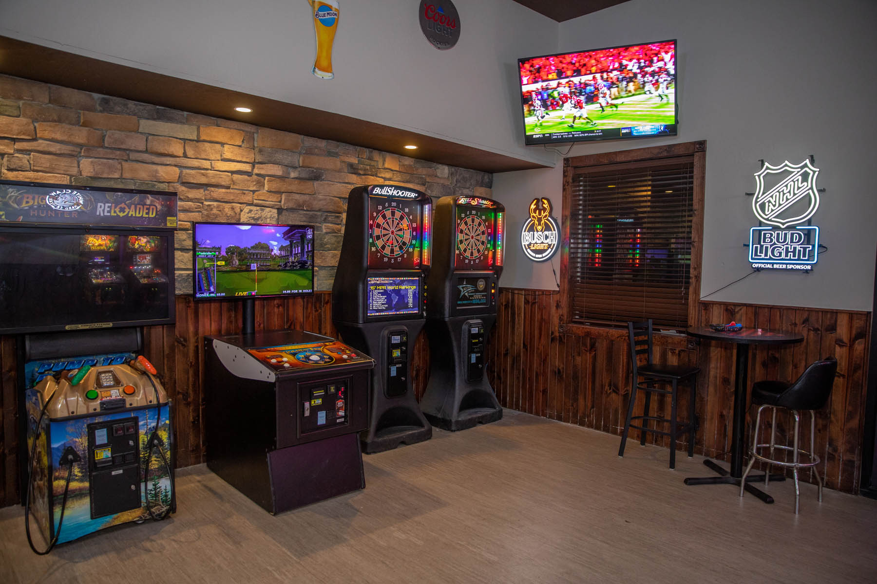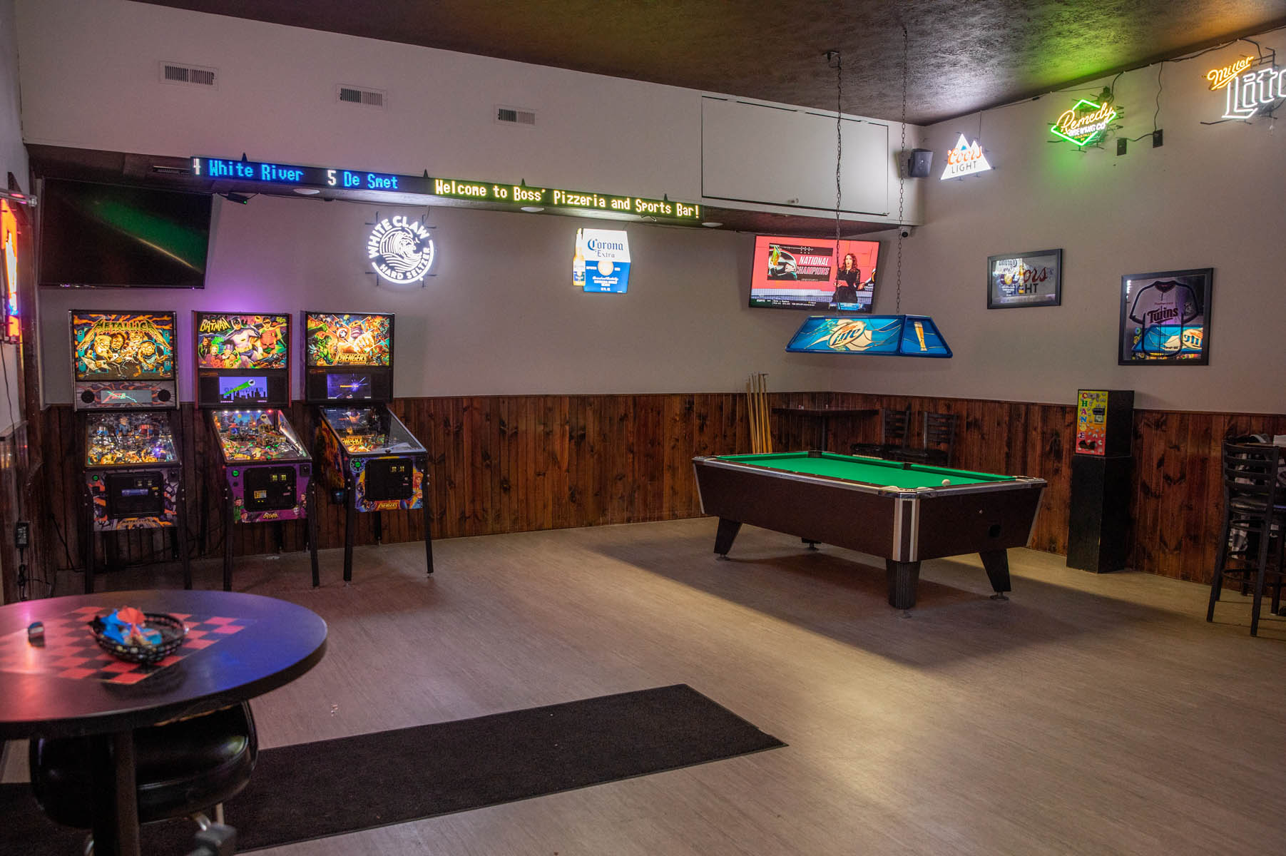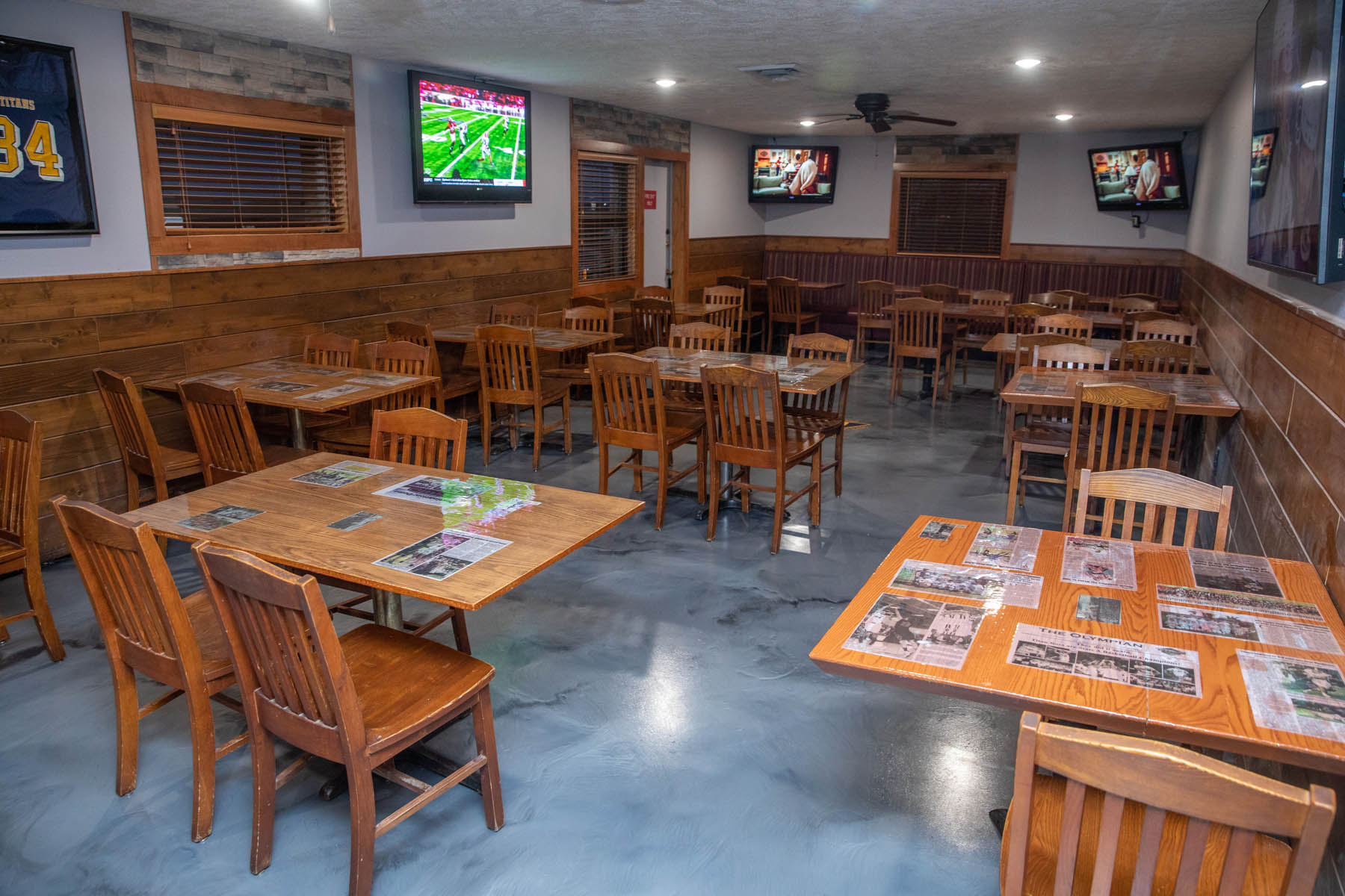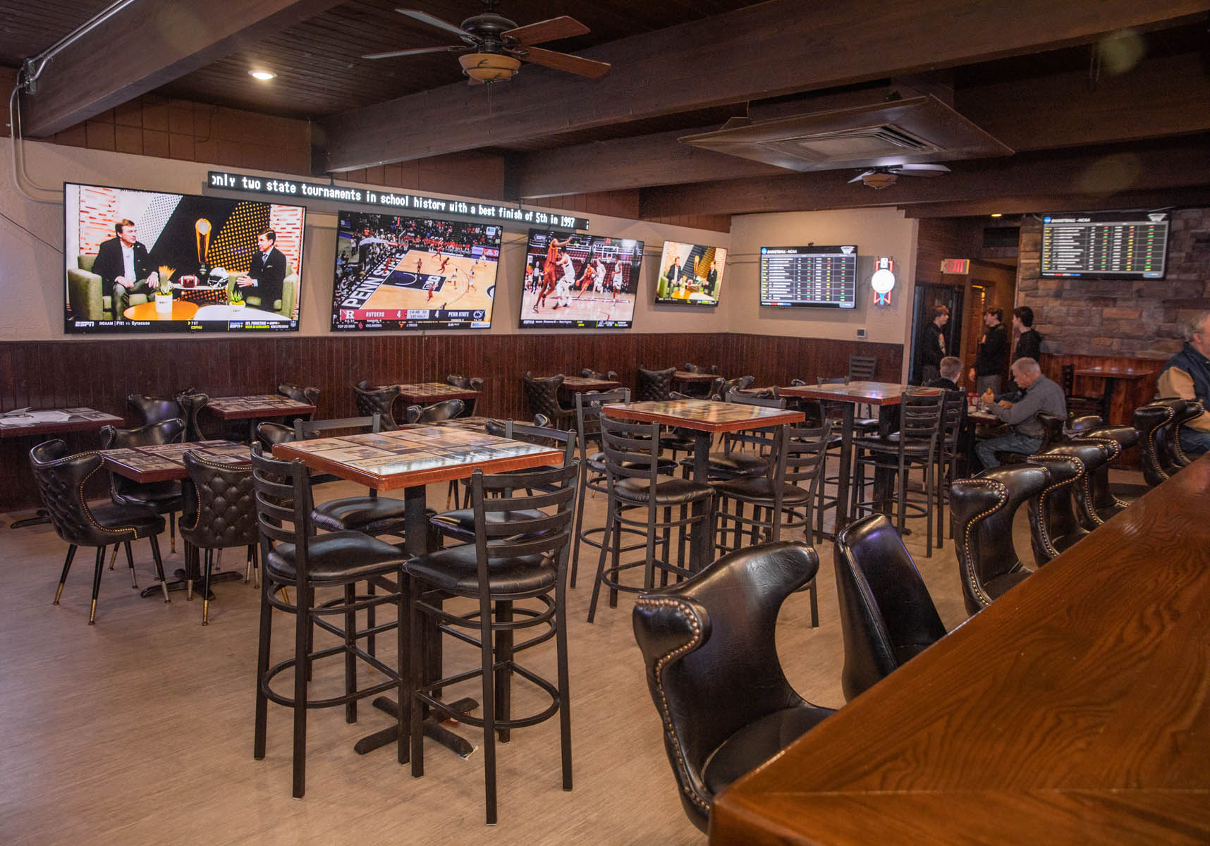The spacious bar, game room and video lottery casino opened first, providing seating for about 80 sports fans to watch games on the big-screen TVs and read local sports highlights scroll on the tickers. High-top and regular tables feature newspaper clippings of Tea Area High School athletics.