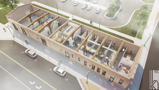 The 5,500-square-foot building will include co-working, meeting and event spaces and other amenities to support entrepreneurs. The organization also anticipates using the loading dock for co-working and event space as weather permits.
