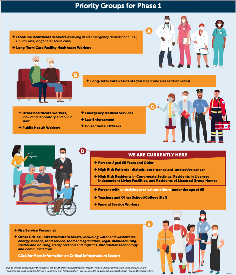 South Dakota remains a leader in nationwide vaccination efforts with more than 30 percent of its population having received at least one dose of the COVID-19 vaccine. Here’s a look at everyone currently eligible, along with who is next in group E.