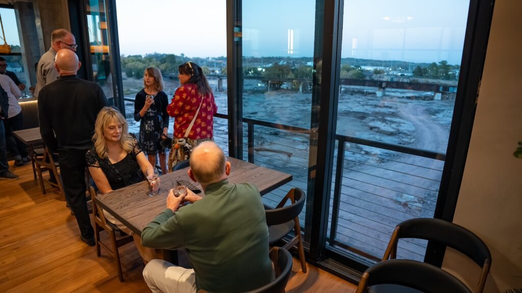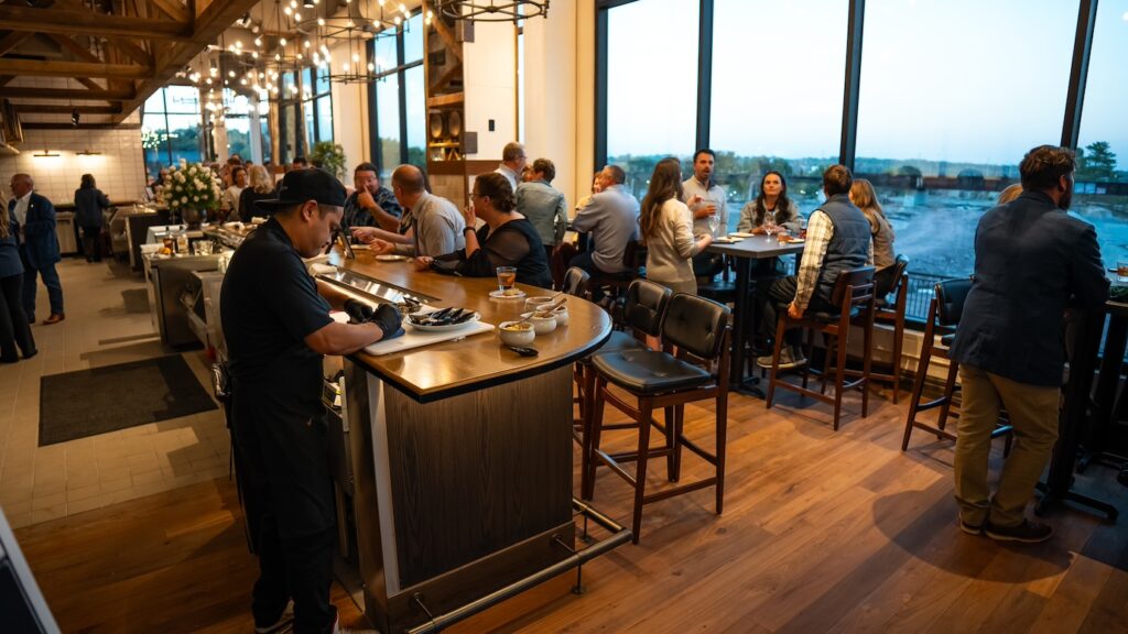 Ironwood is a two-story restaurant with multiple dining and bar areas, including a riverfront patio on the first floor and sliding floor-to-ceiling windows on the second floor.
